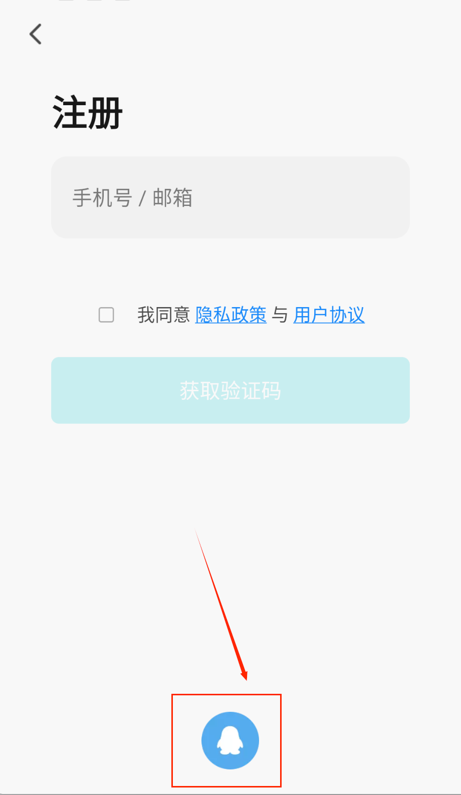 1、打开软件看到欢迎界面呢,点击注册按钮进入注册页面。输入手机号或邮箱地址,记得勾选同意用户协议那个小方框哦。