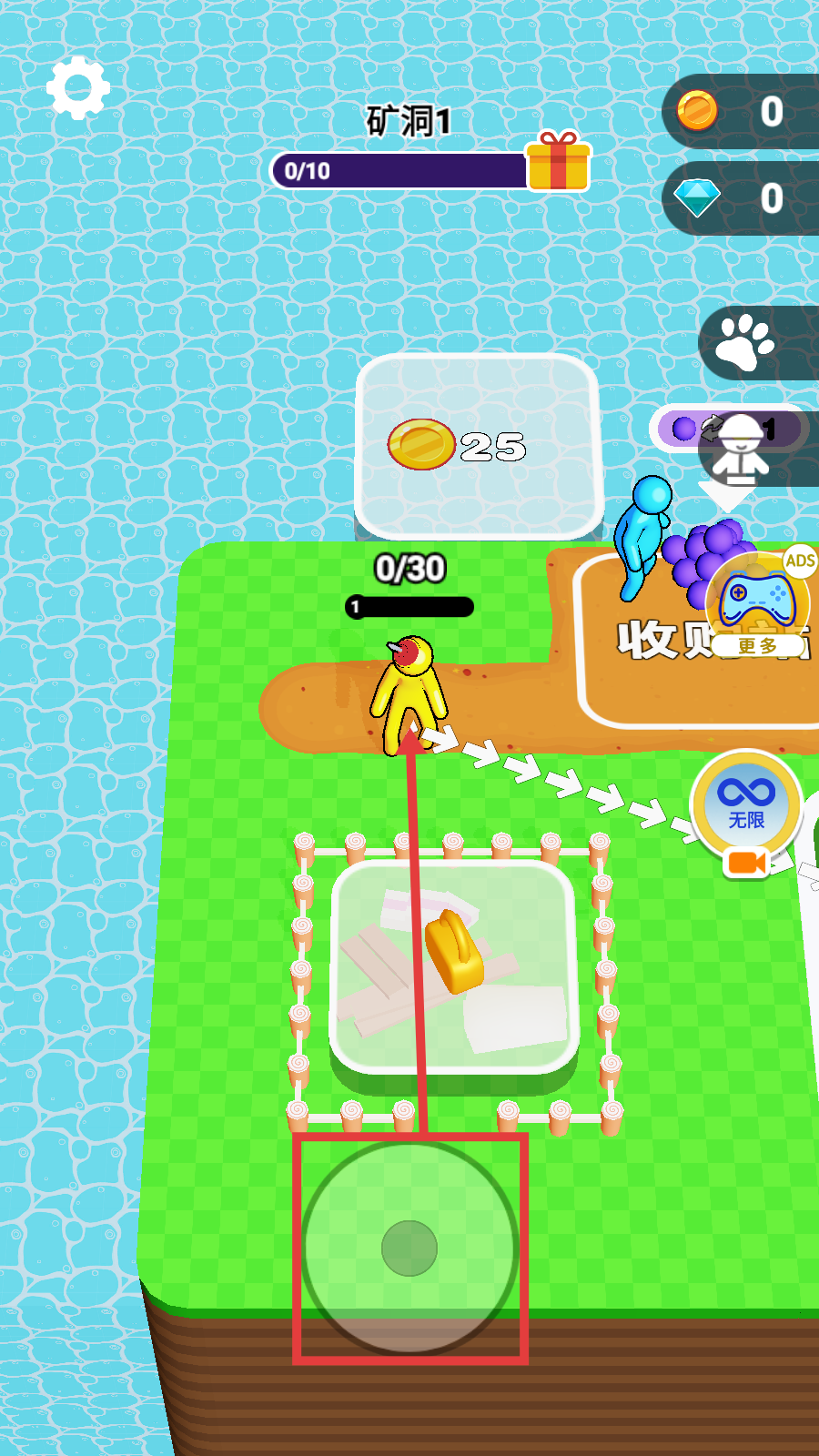 1、矿洞1开局,点击角色下方红框区域启动挖掘,推进【0/10】矿洞进度,积累初始资源。