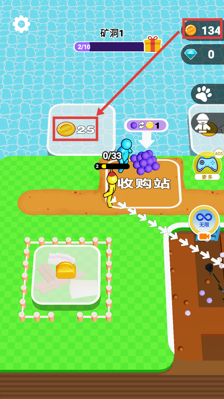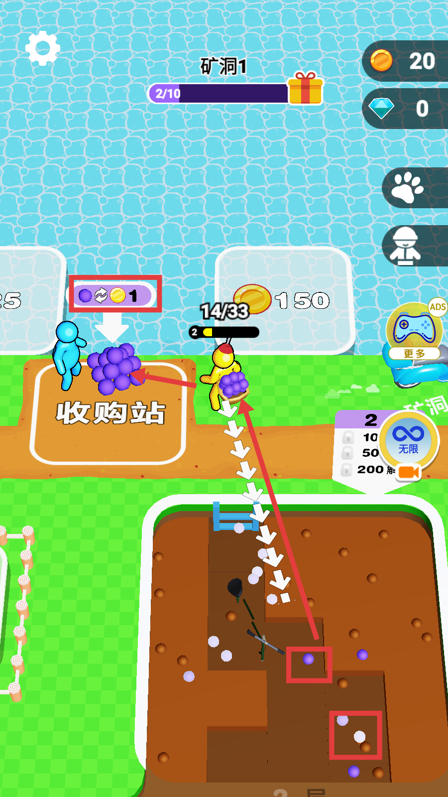 2、深入矿洞采集红框紫色资源,运送至【收购站】,按【紫↔金-1】兑换金币,快速积累财富。