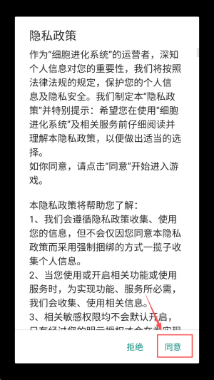 2、阅读《细胞进化系统》隐私政策,点击“同意”授权必要信息。