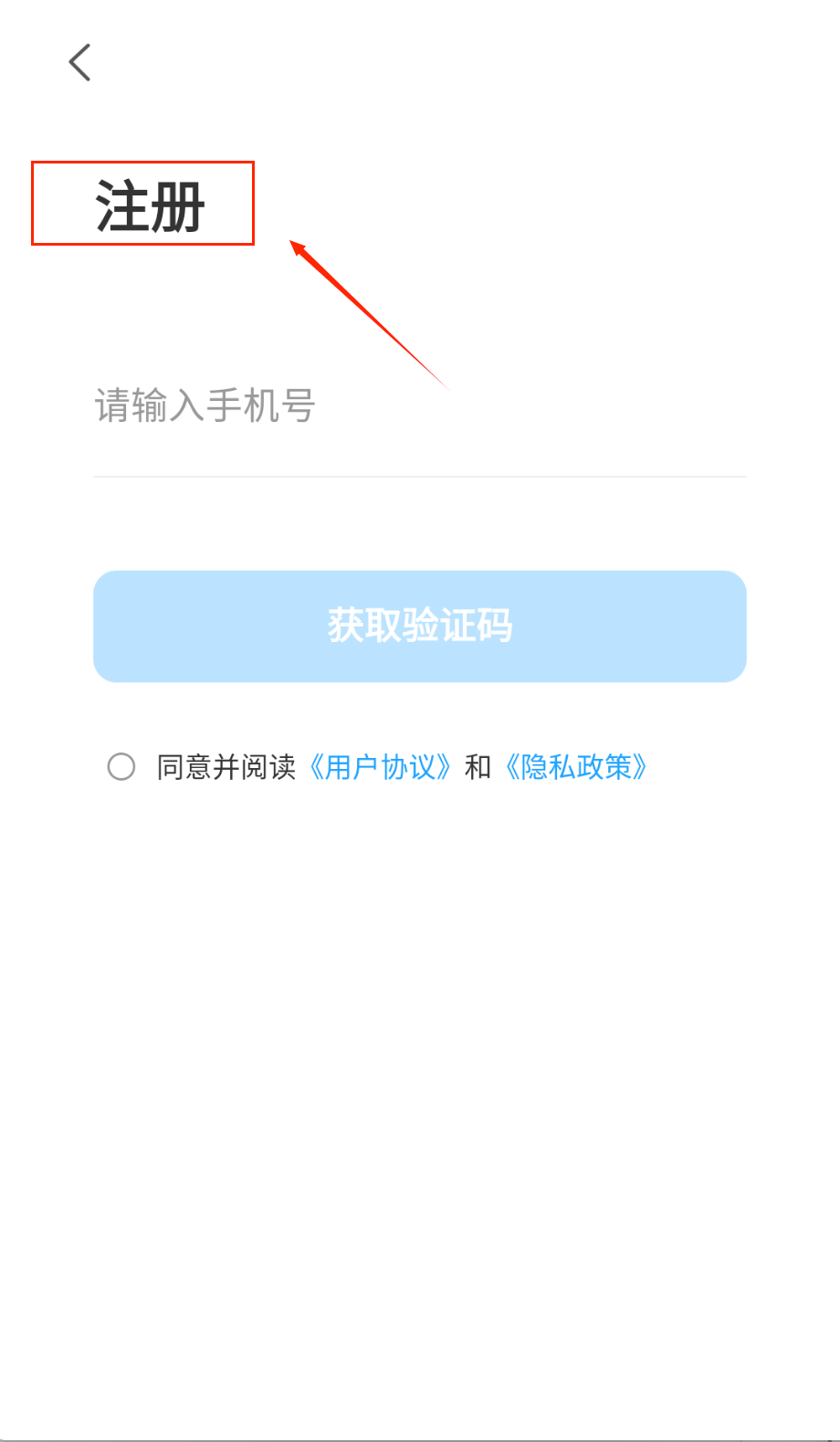 1、打开软件看到注册界面呢,输入11位手机号码要仔细核对。点击获取验证码按钮,等待短信送达填写验证码。