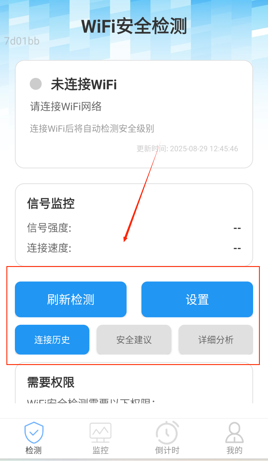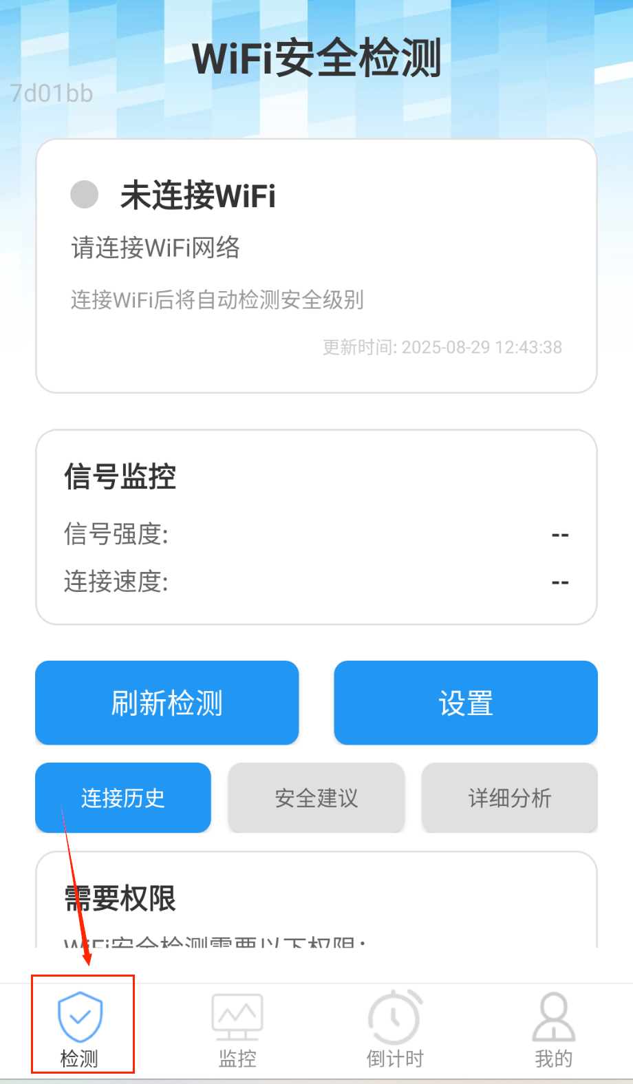 2、点击主界面的安全检测按钮开始全面扫描,系统会检测加密方式、信号强度等关键指标,约30秒生成详细的安全评估报告。