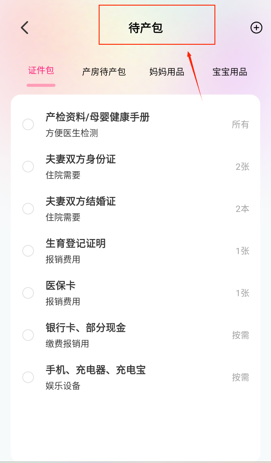 4、待产包清单包含50多项经过验证的必备物品建议,支持根据个人需求进行个性化调整,确保分娩准备万无一失。