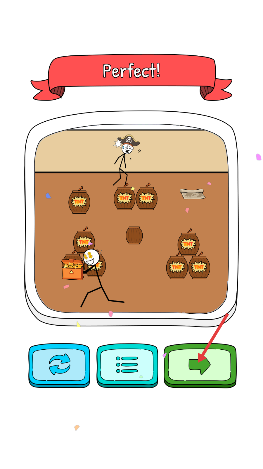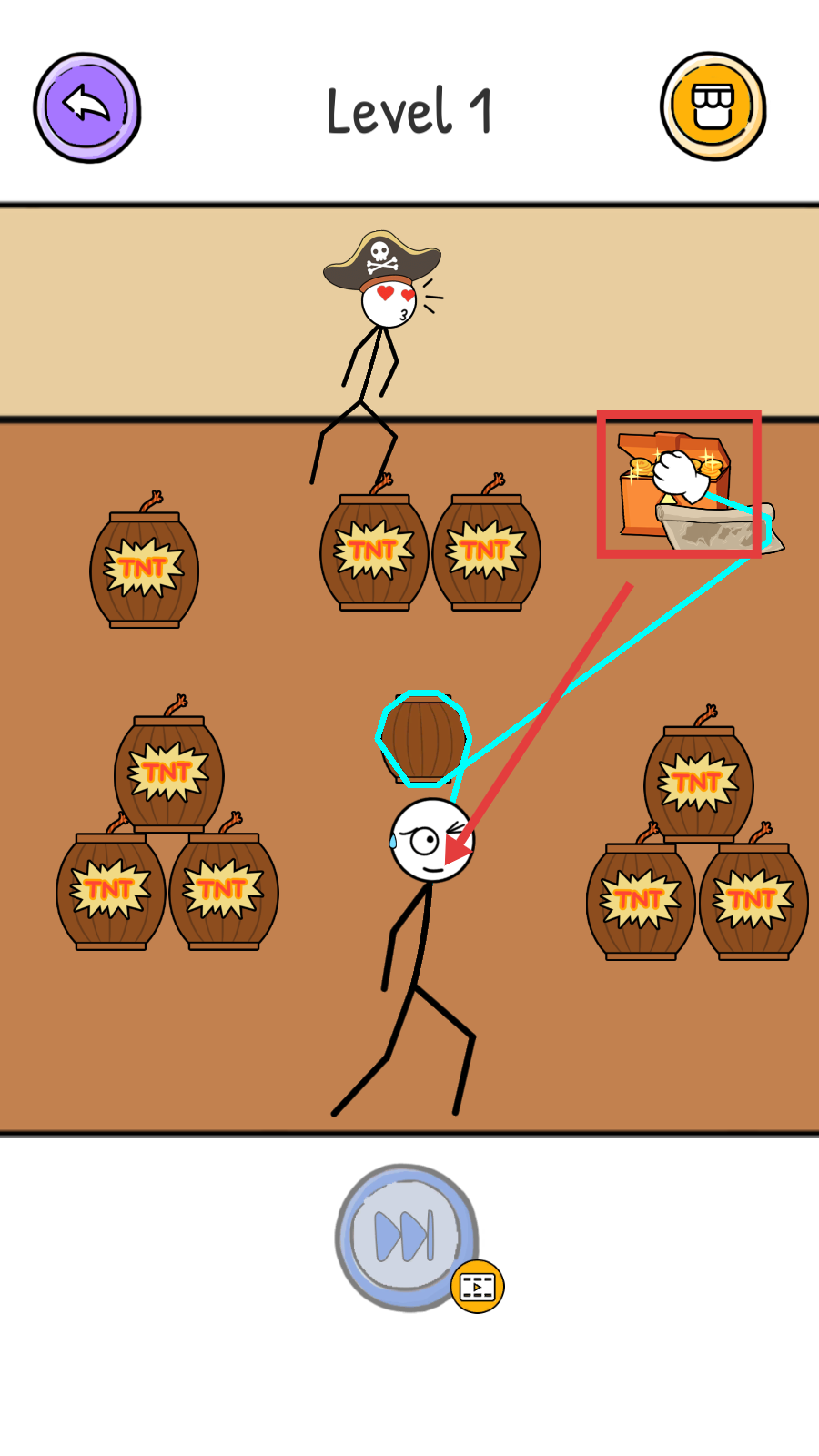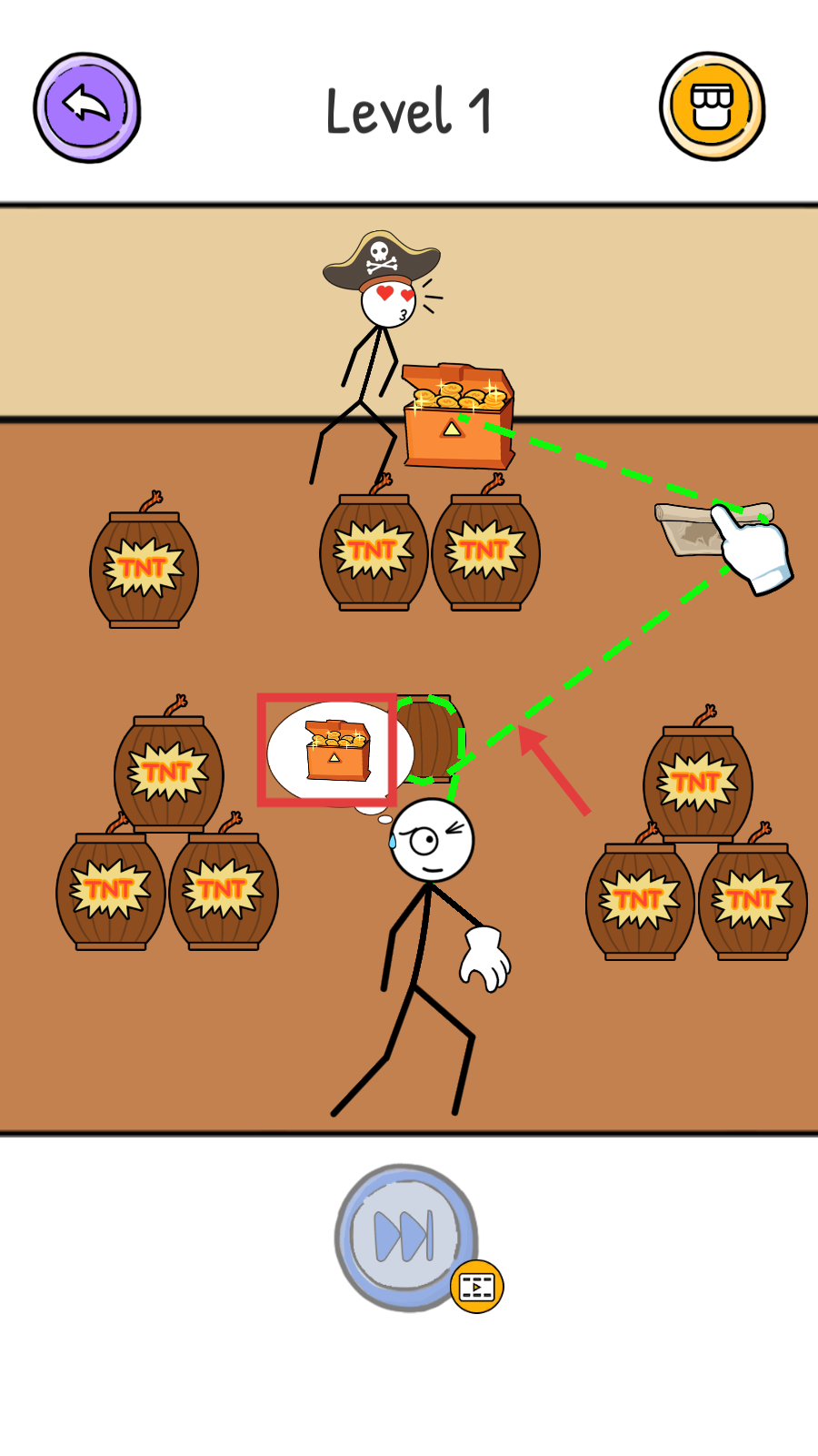 2、在【Level-1】,观察海盗与【TNT】布局,明确下方火柴人目标宝箱位置,规划行动路径。