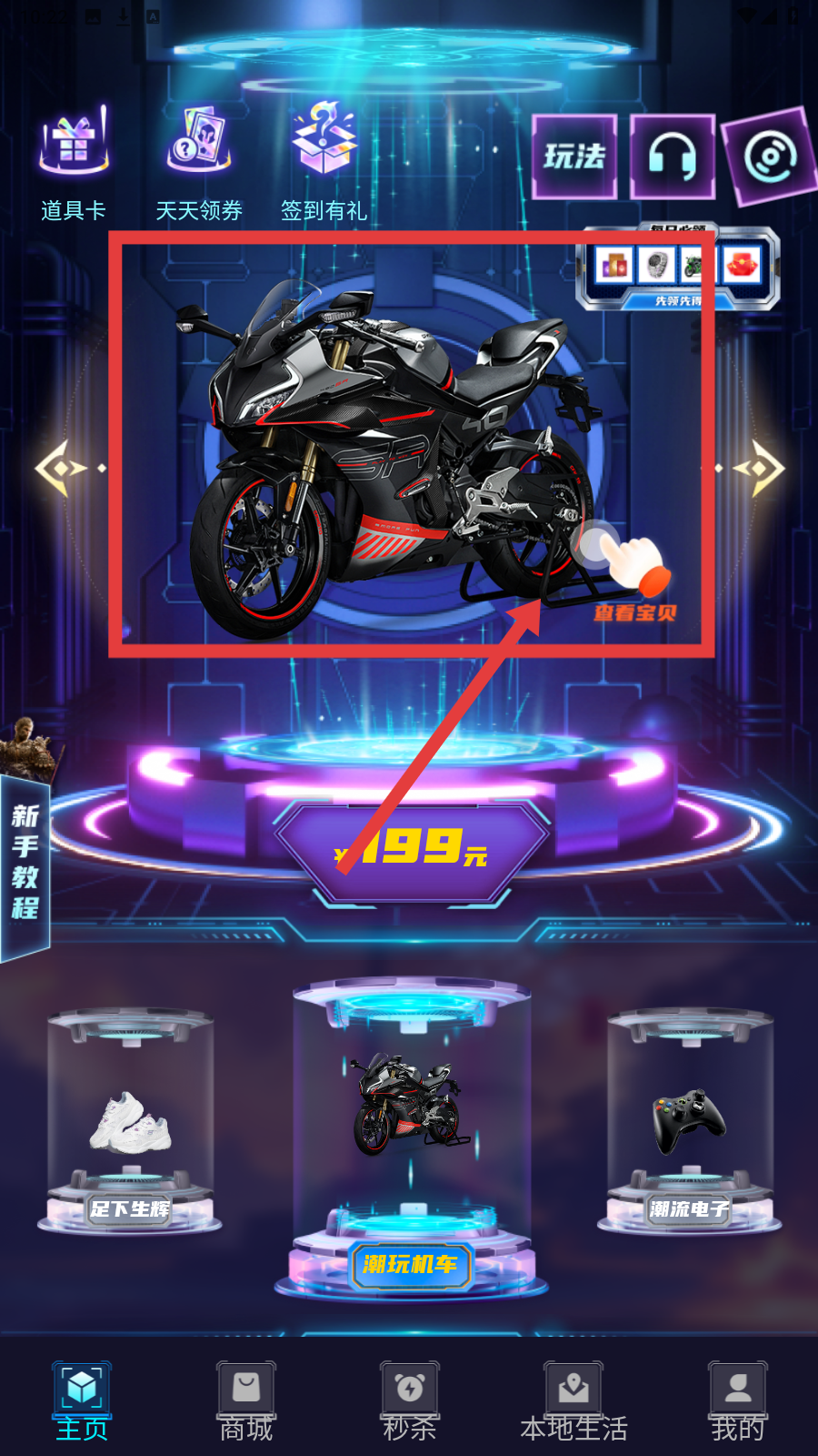 1、在主页点摩托车区域,可查看商品详情,了解【199元】潮玩机车信息。