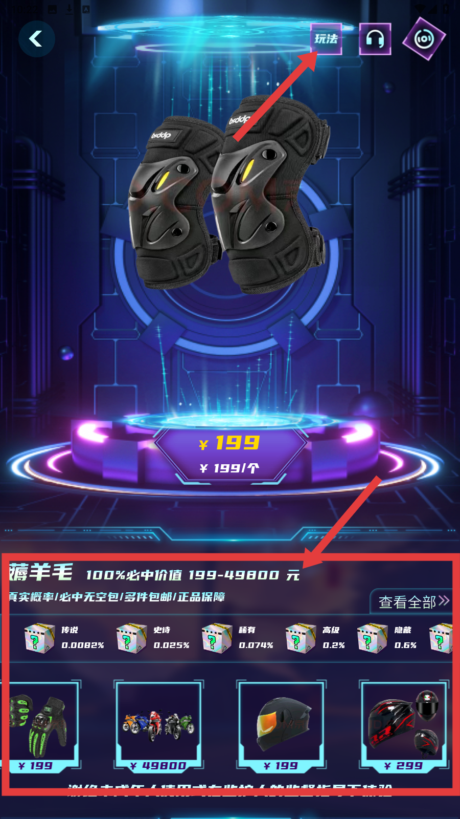 2、点右上角【玩法】,查看【薅羊毛】活动,了解必中商品及概率。