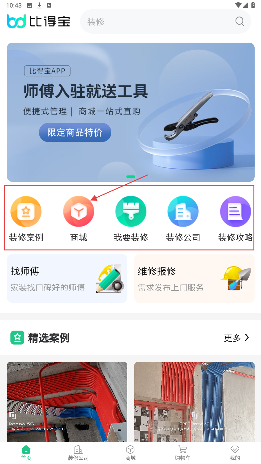 1、打开【比得宝】APP,点【商城】,进入家装材料选购页。
