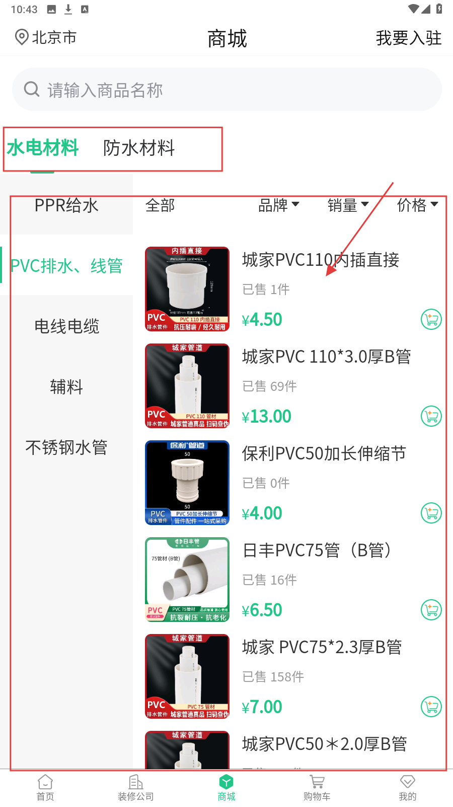 2、在【商城】选分类,如【水电材料】,浏览【PVC排水-线管】商品。