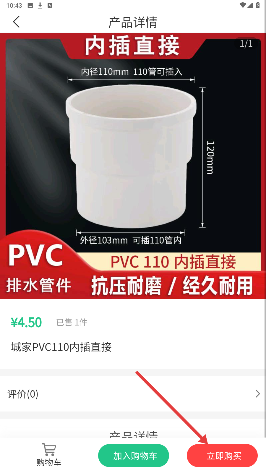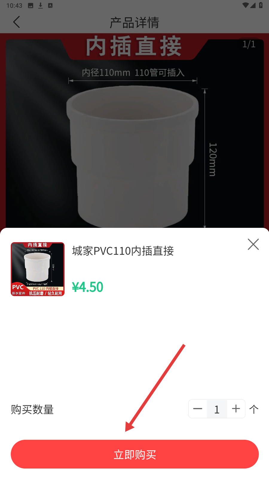 3、进入商品详情,查看【城家PVC110内插直接】参数,点【立即购买】。