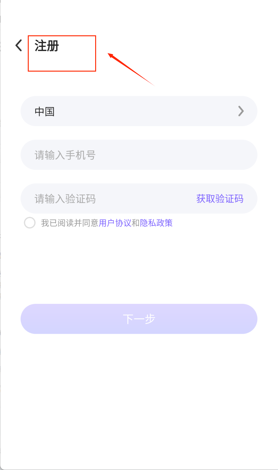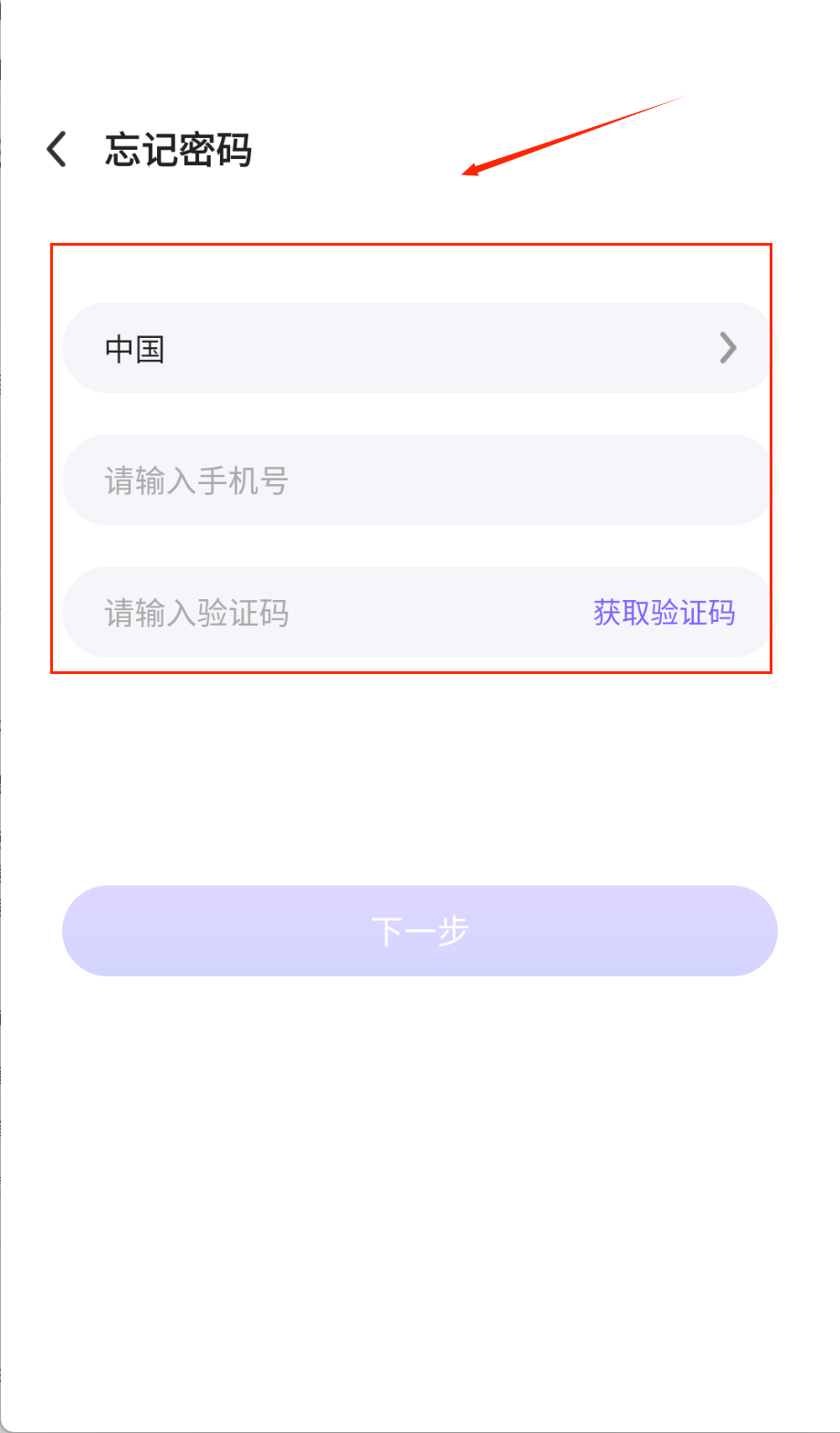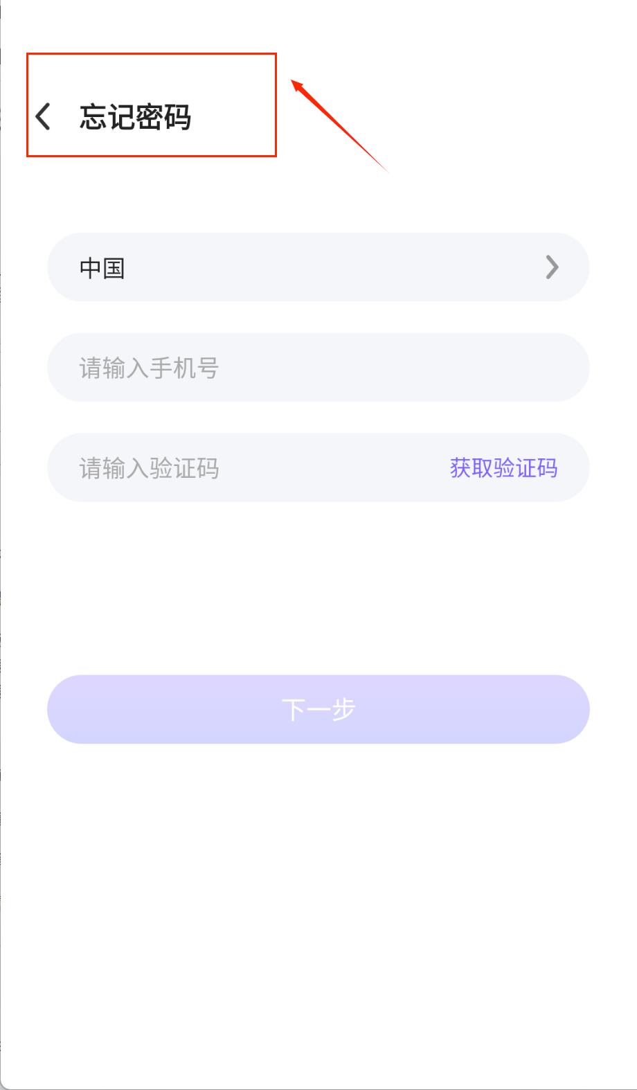 1、在忘记密码页面点击左上角返回箭头可退回上页,国家选择栏默认中国还支持切换其他地区呢。记得先选对国籍再填手机号哦。