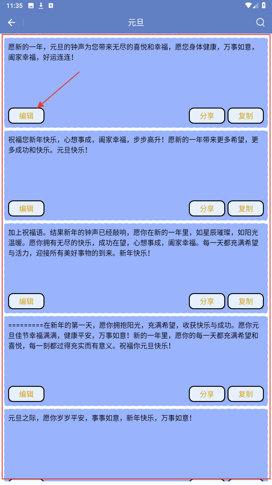 2、在【元旦】文案列表,点【编辑】,可修改文案,适配场景需求。
