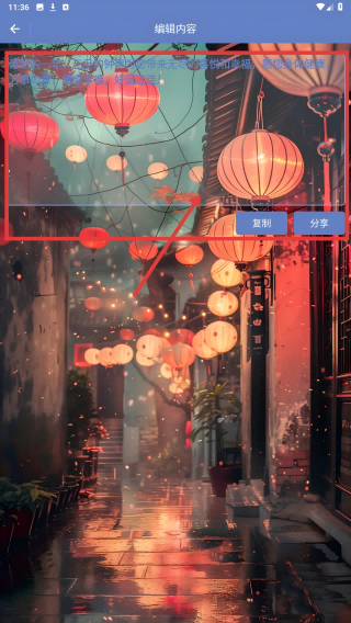 3、编辑内容页,添加图片、调整文案,完成后点【分享】或【复制】使用。