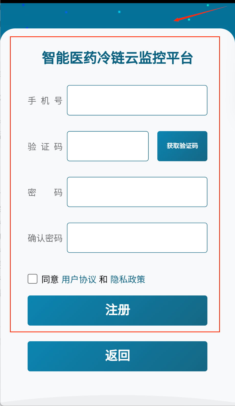 2、注册时需要输入手机号获取验证码,设置密码并勾选用户协议,最后点击蓝色注册按钮完成账号创建。