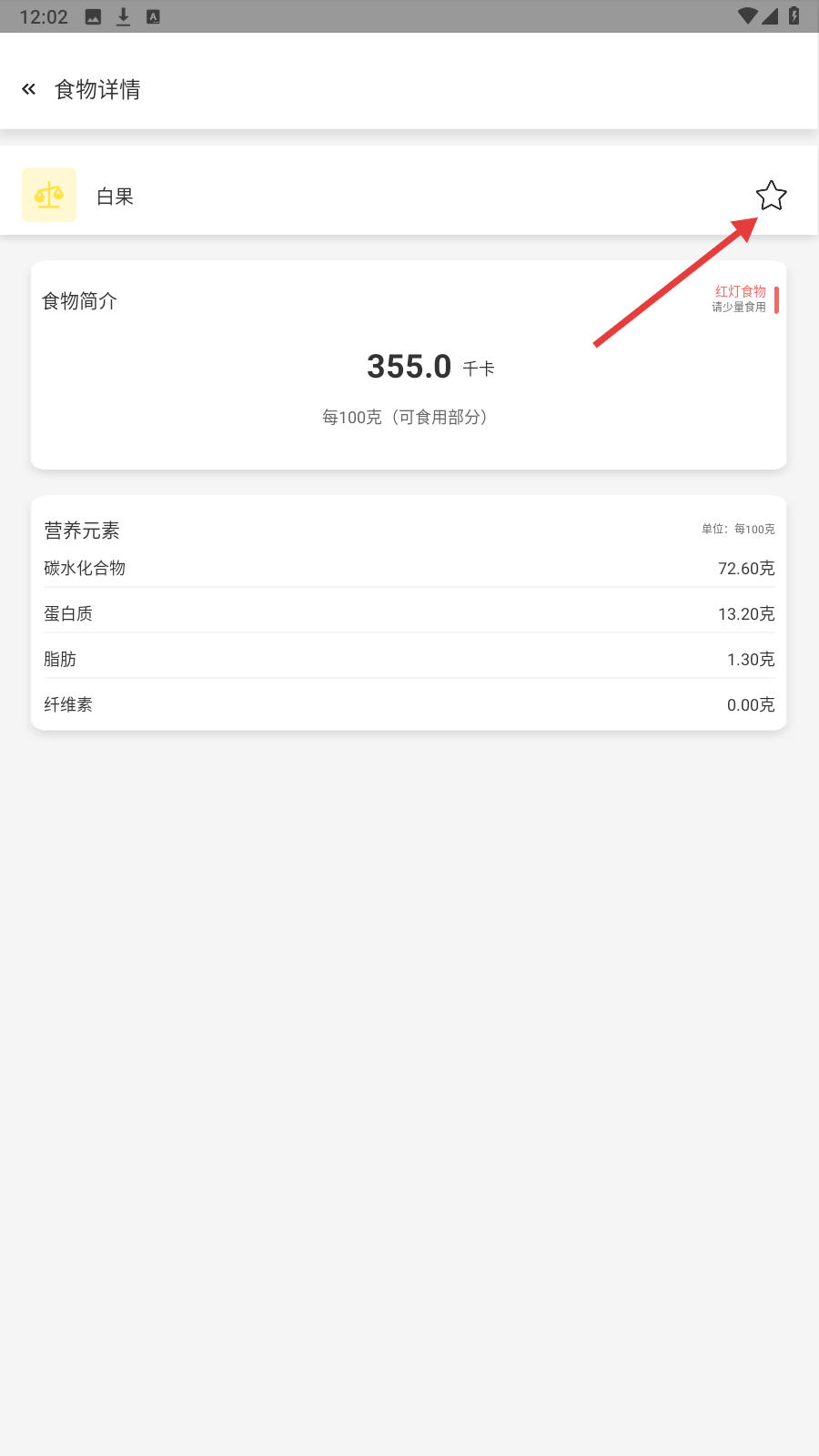 3、进入食物详情页,点右上角收藏图标,将【白果】加入【食物收藏】。