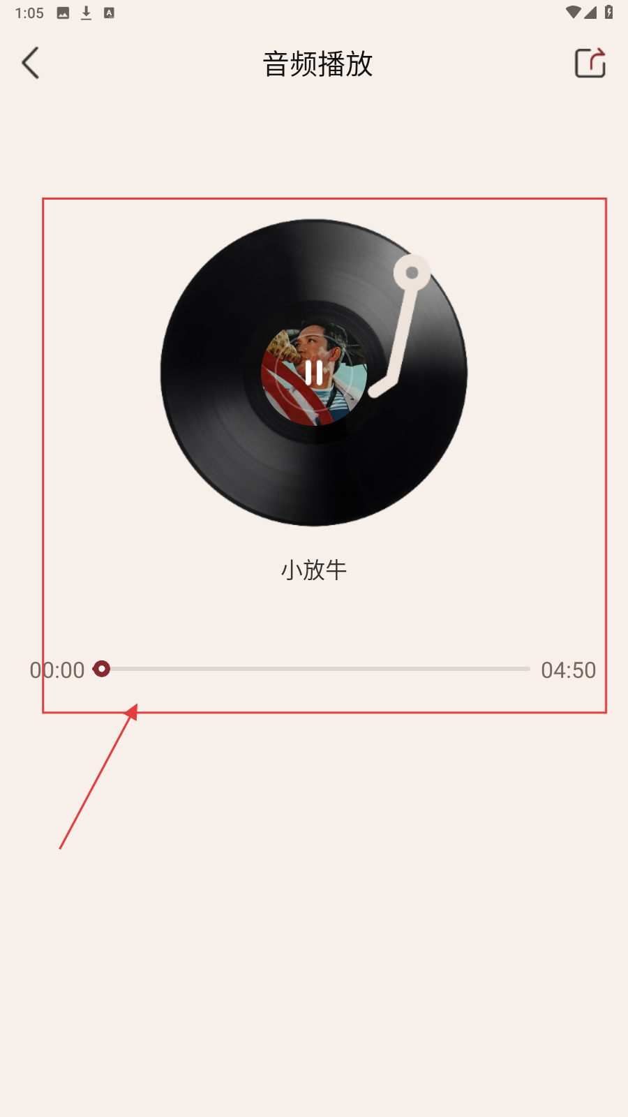 2、在音频播放页,查看黑胶唱片样式,拖动进度条,控制【小放牛】播放进度。
