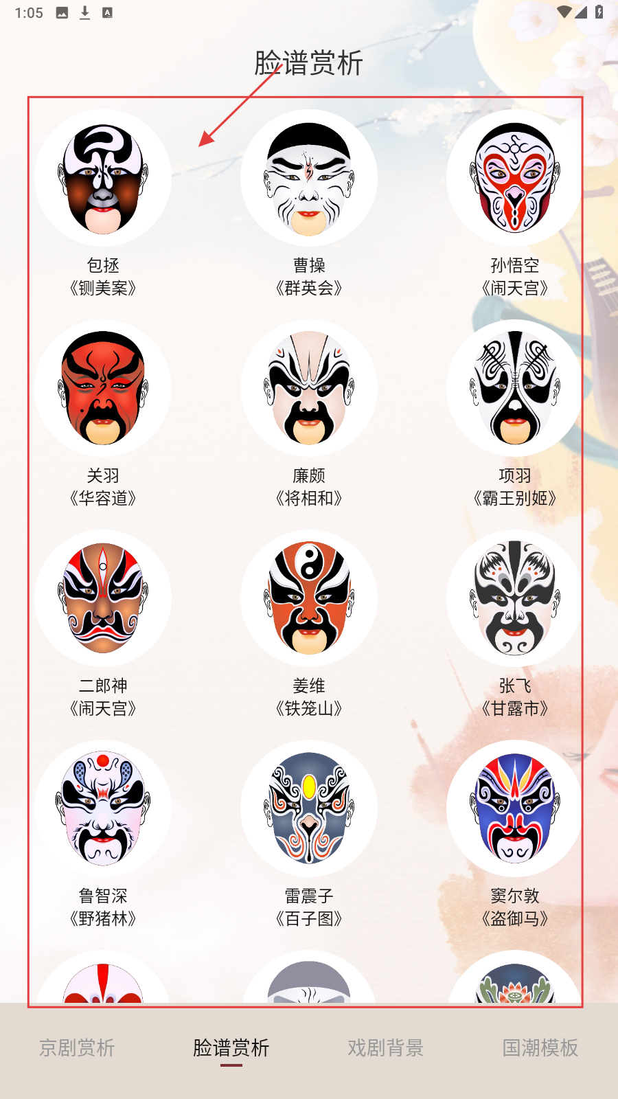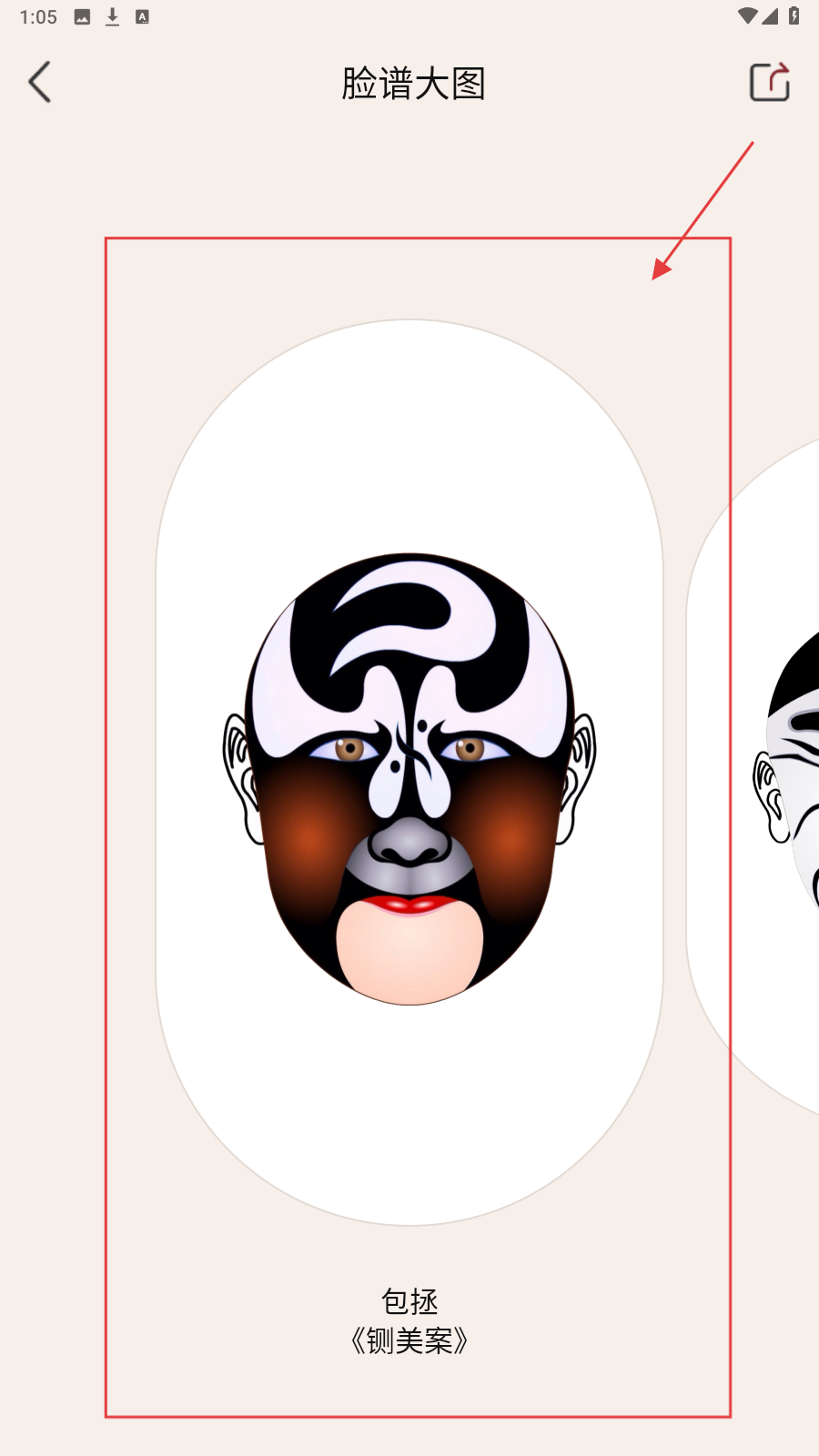3、切换到脸谱赏析页,选【包拯】等脸谱,查看对应剧目《铡美案》介绍。