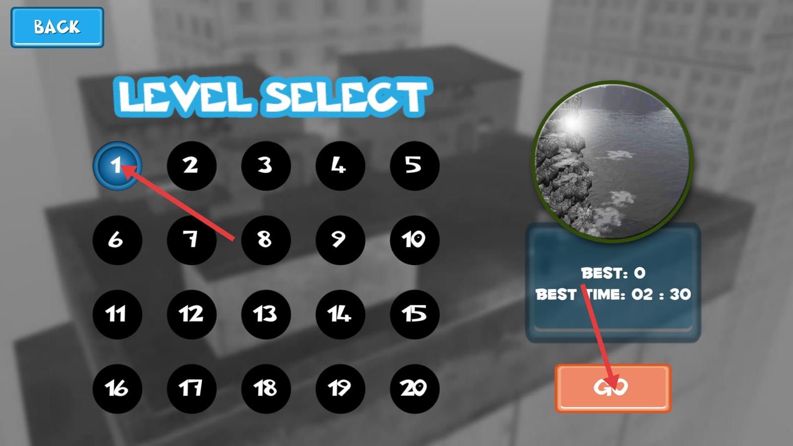 1、在关卡选择界面,点击【1】号关卡,再按右侧【GO】按钮,开启首关冒险之旅。