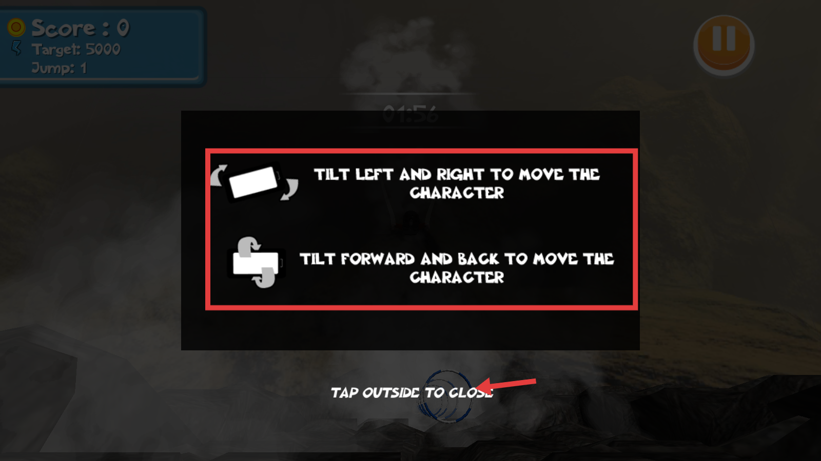 2、开局出现操作提示,记住【TILT-LEFT-AND-RIGHT-TO-MOVE-THE-CHARACTER】规则,点击提示外区域关闭。