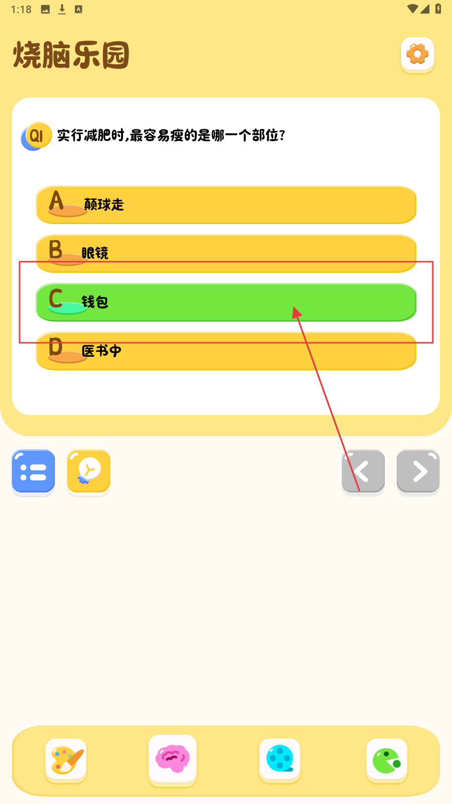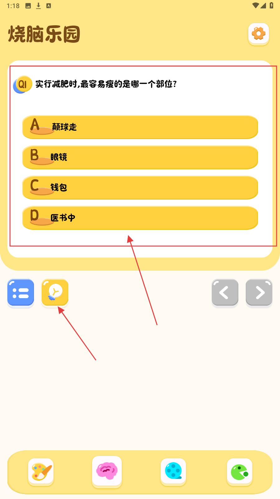 1、进入烧脑乐园,看题目“减肥易瘦部位”,点灯泡图标,获取提示。