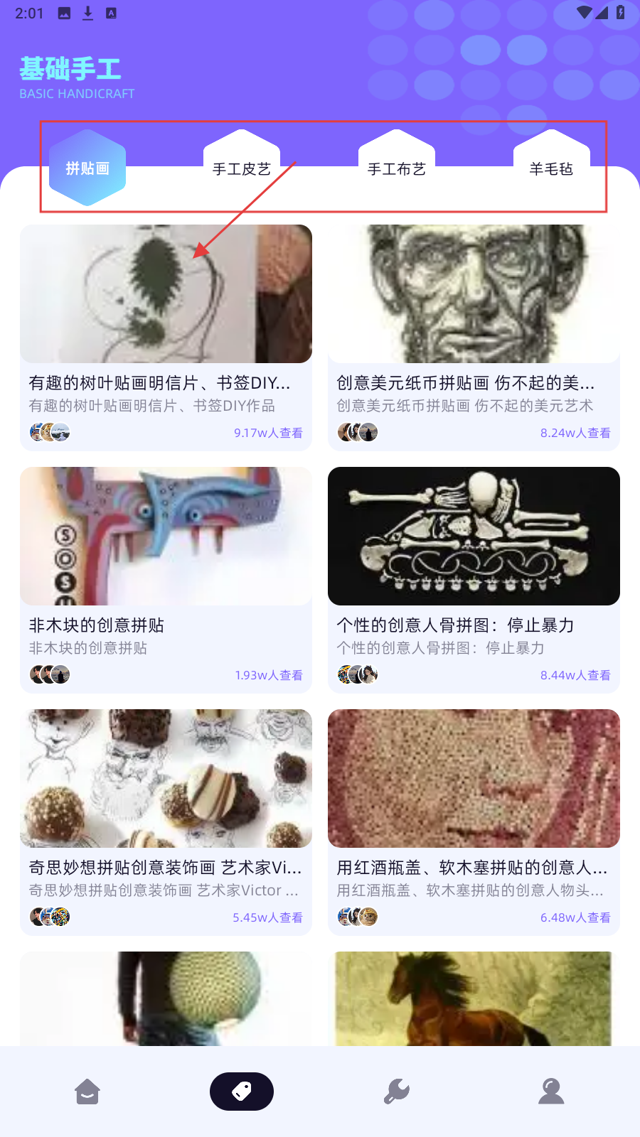 3、进入【基础手工】,点【拼贴画】分类,选感兴趣作品,如树叶贴画,开启创意制作。