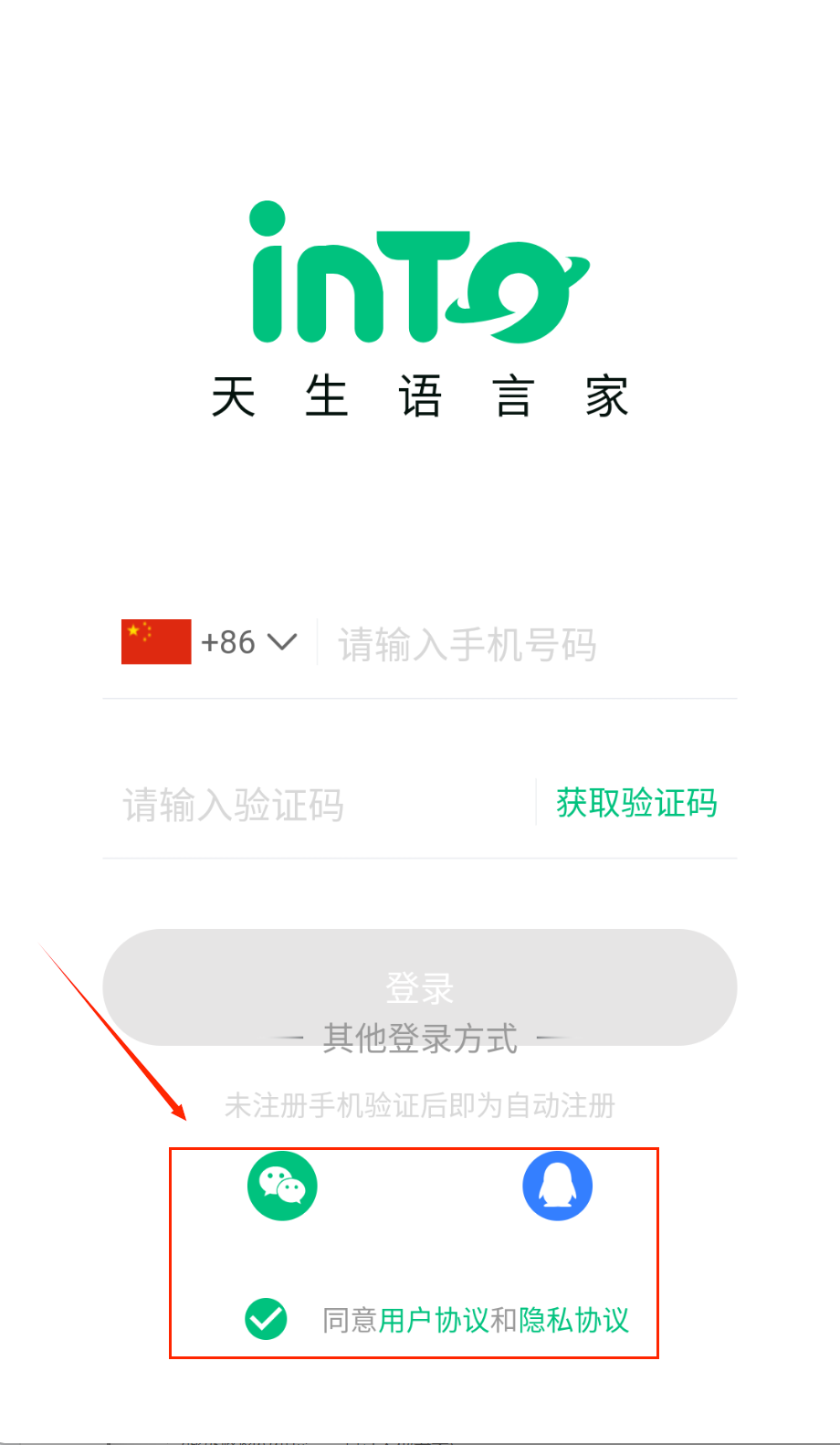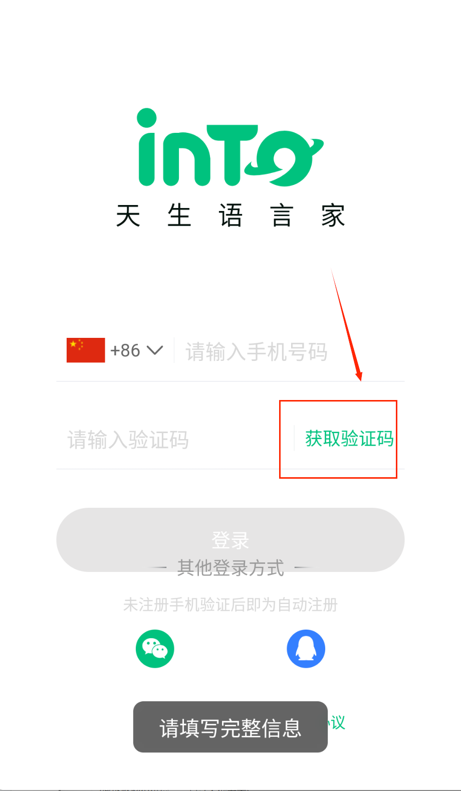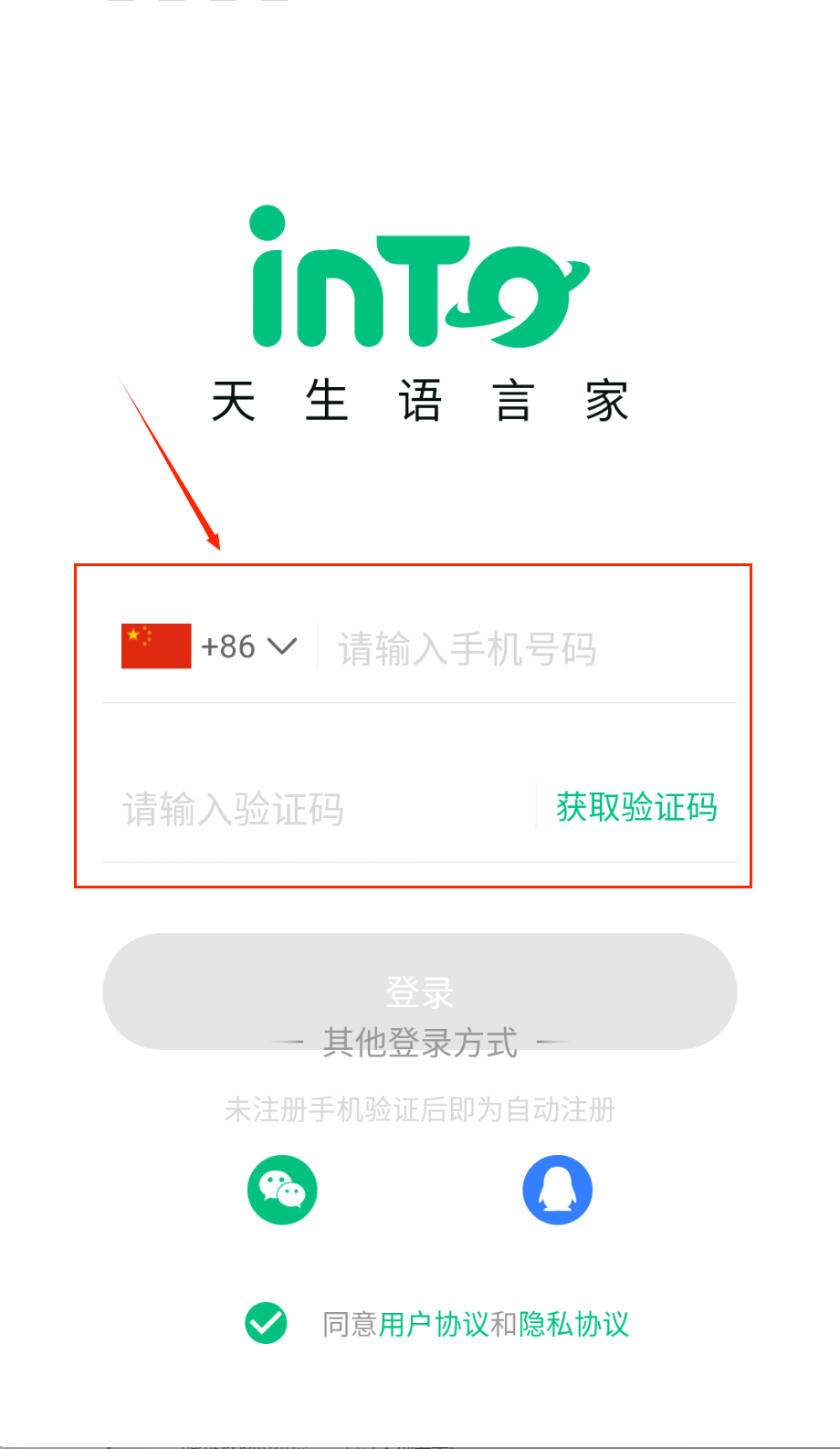 1、打开软件后首先会看到简洁的登录界面,在手机号输入框内输入您的号码,注意左侧默认显示中国+86区号。