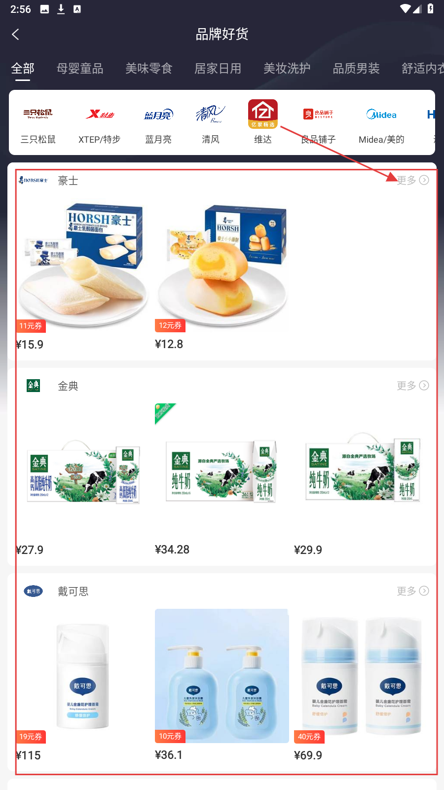 2、在【品牌好货】页,点【更多】,查看全品牌商品及优惠。