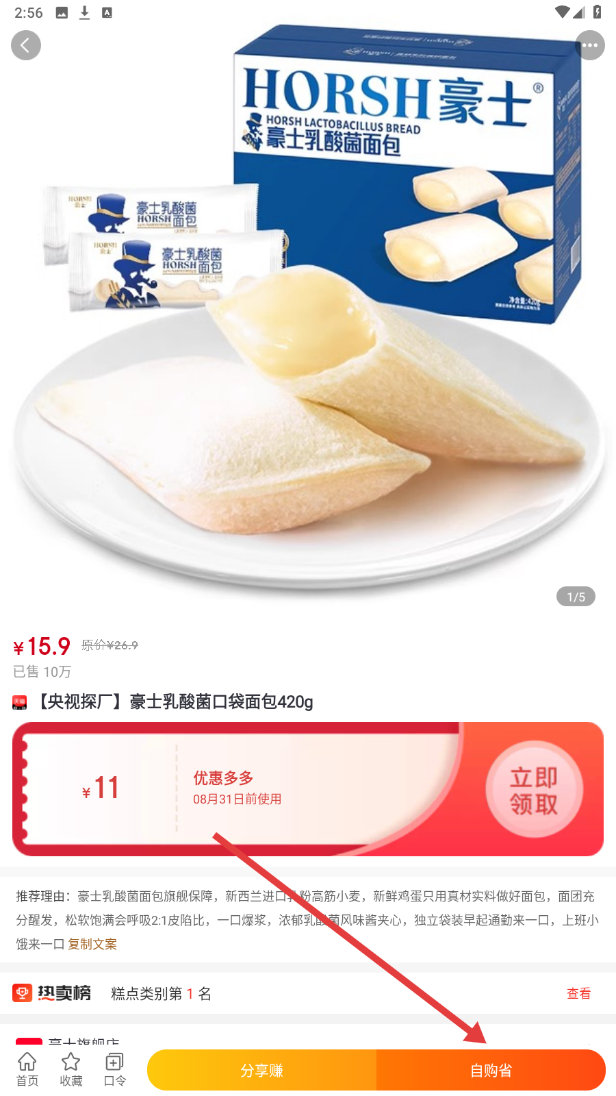 4、查看商品页,领券后点【自购省】下单,享优惠购豪士面包。
