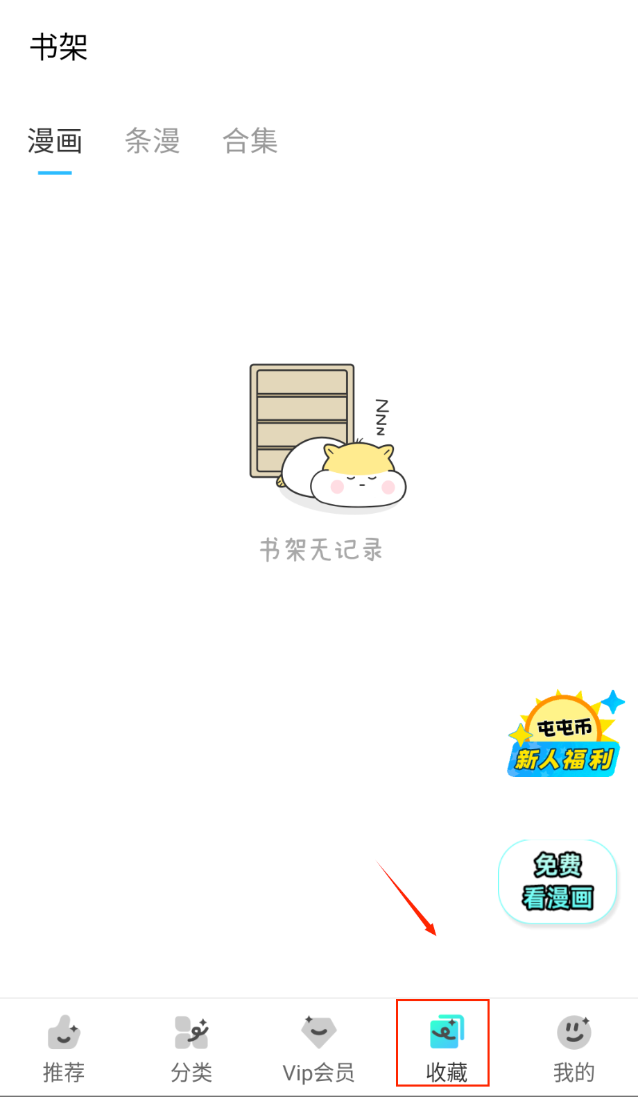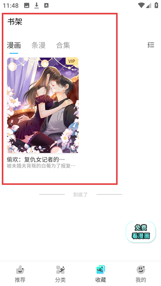 4、切换到收藏页的书架界面,能看到刚收藏的漫画,点它就能直接进入阅读页面继续看啦。