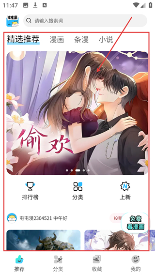 1、完成安装后首次打开应用会直接进入首页,这里按照漫画、小说等分类展示各类作品,也可以通过顶部搜索框直接输入作品名称进行查找。