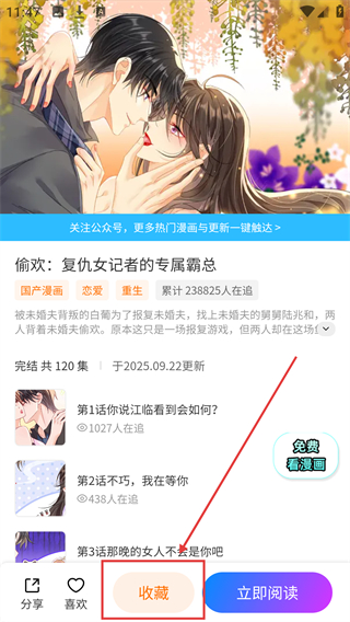 2、进入漫画详情页后,能看到剧情介绍和章节列表,点【收藏】按钮就能把这部漫画加入书架哦。