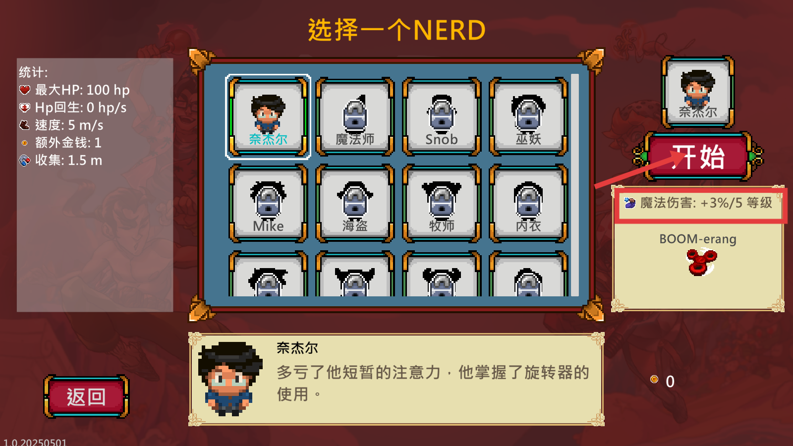 1、选择【奈杰尔】,其拥有【魔法伤害-+3%/5等级】特性,点击【开始】开启沙漠冒险之旅。