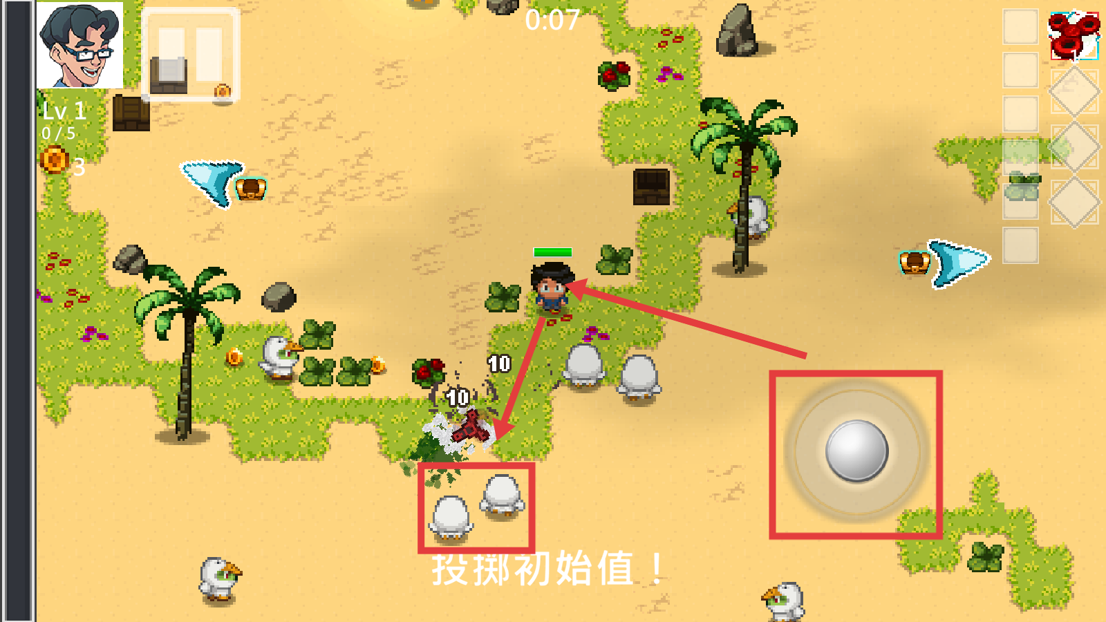2、战斗时滑动右侧轮盘,投掷【BOOM-erang】攻击白色生物,收集金币,提升角色等级。