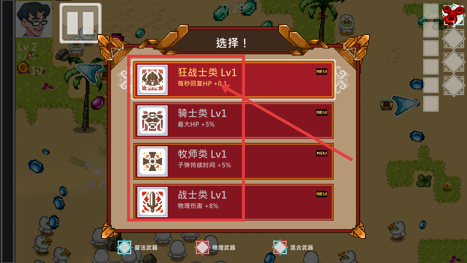 3、升级界面可选【狂战士类-Lv1(每秒回复HP-+0.1)】等职业,按需抉择,强化角色能力。