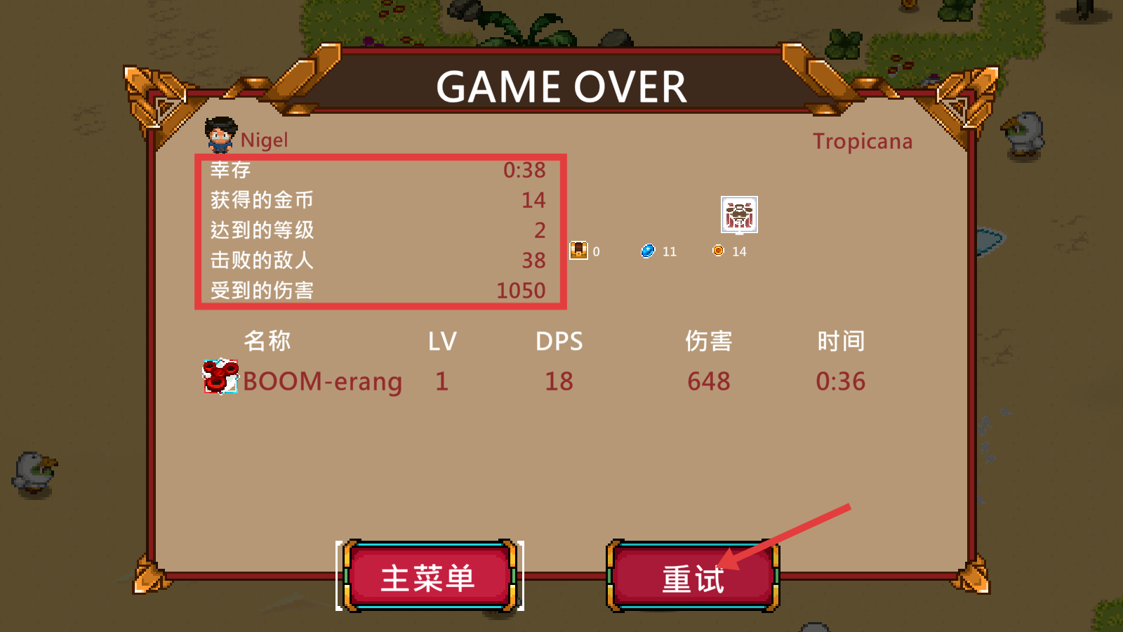 4、结算时查看【幸存-0:38】等数据,分析不足,点击【重试】优化策略,挑战更好成绩。
