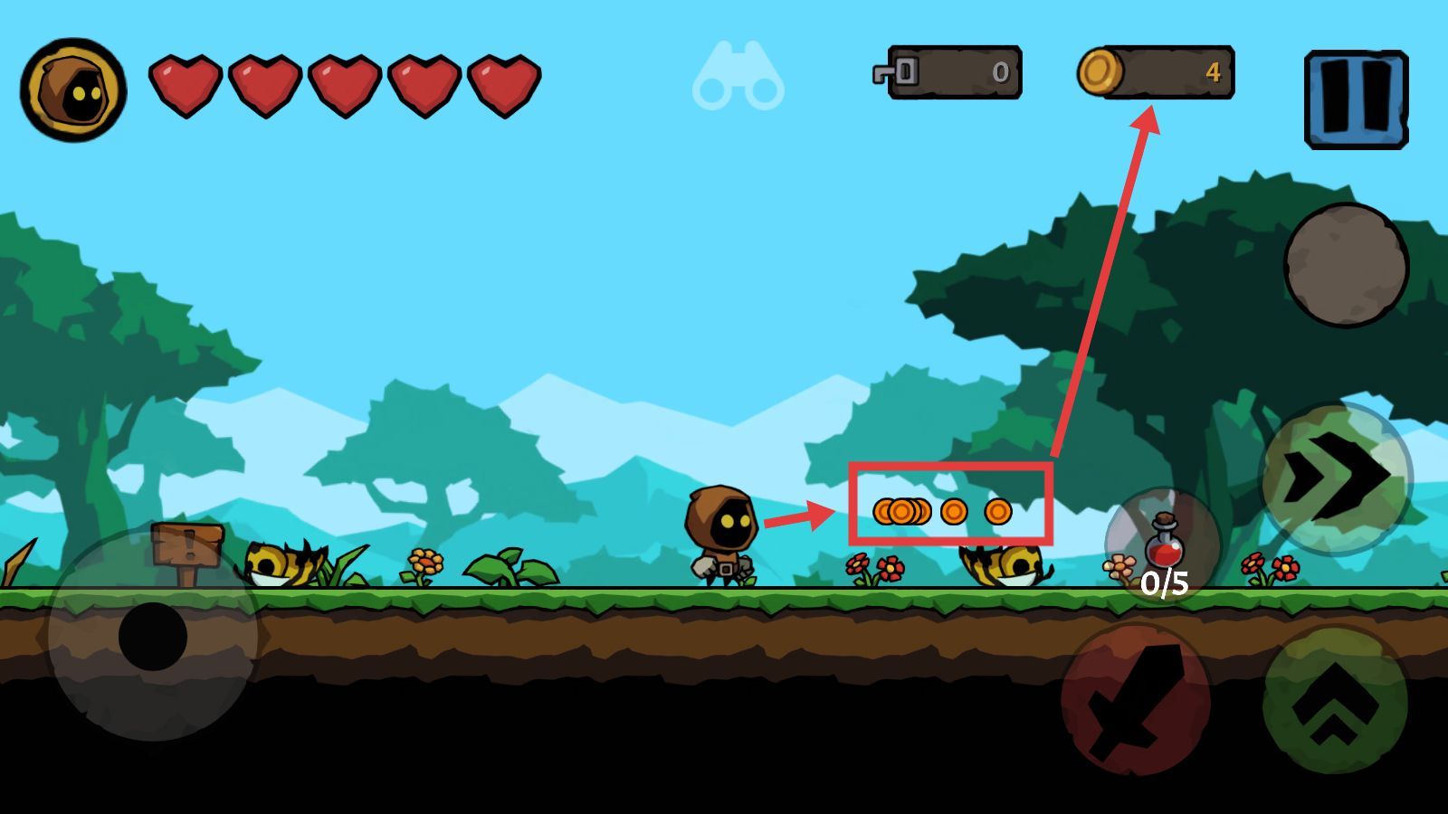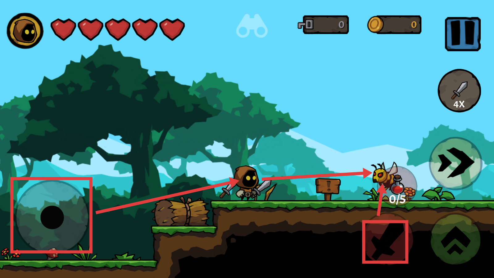 2、战斗时左手控【虚拟摇杆】移动,右手点攻击图标,优先攻击【蜜蜂怪】推进关卡进程。