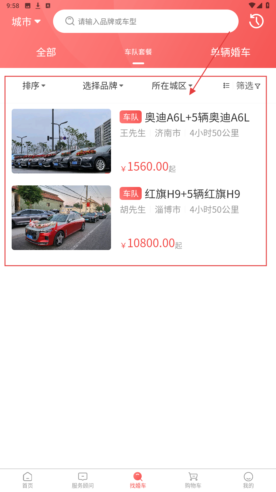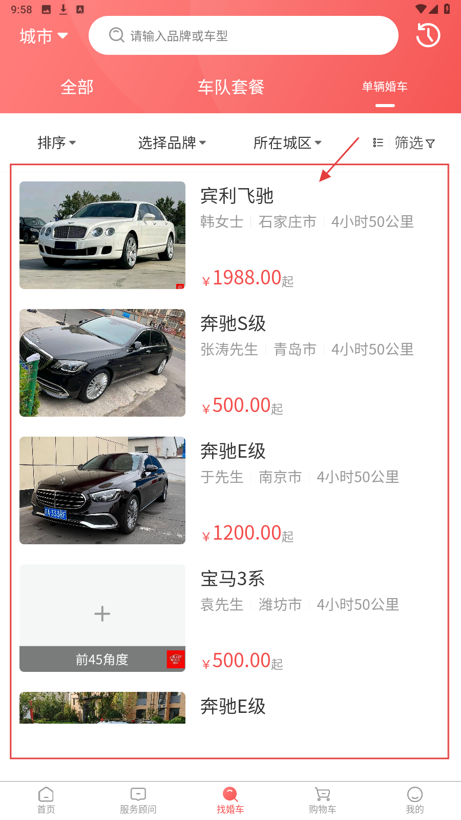2、在单辆婚车列表,挑选心仪车型,查看其价格、车主及服务时长等信息。