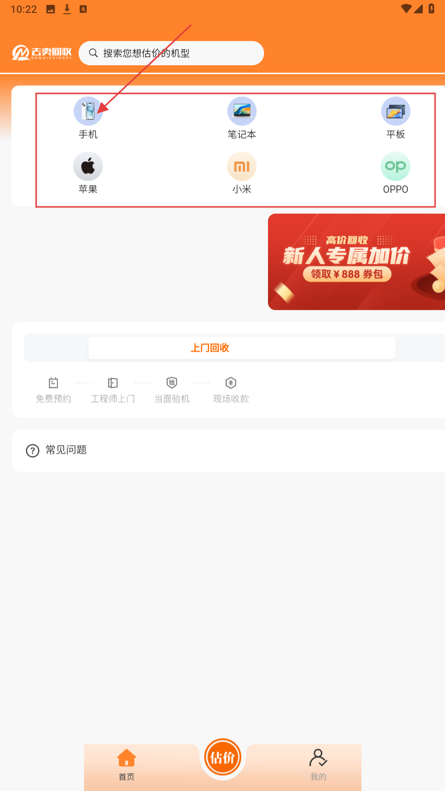 1、进入应用,选要回收的品类,比如【手机】,再挑苹果、华为等品牌,开启回收流程。