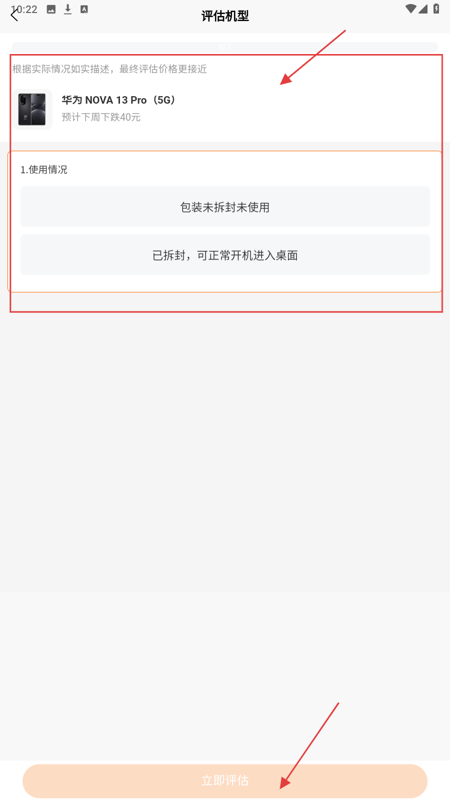 4、进入机型评估页,如实选择使用情况,比如包装是否拆封等,然后点【立即评估】,获取回收价。