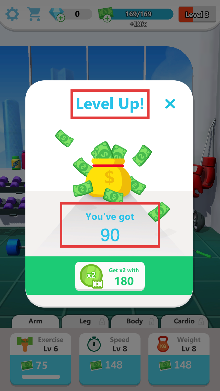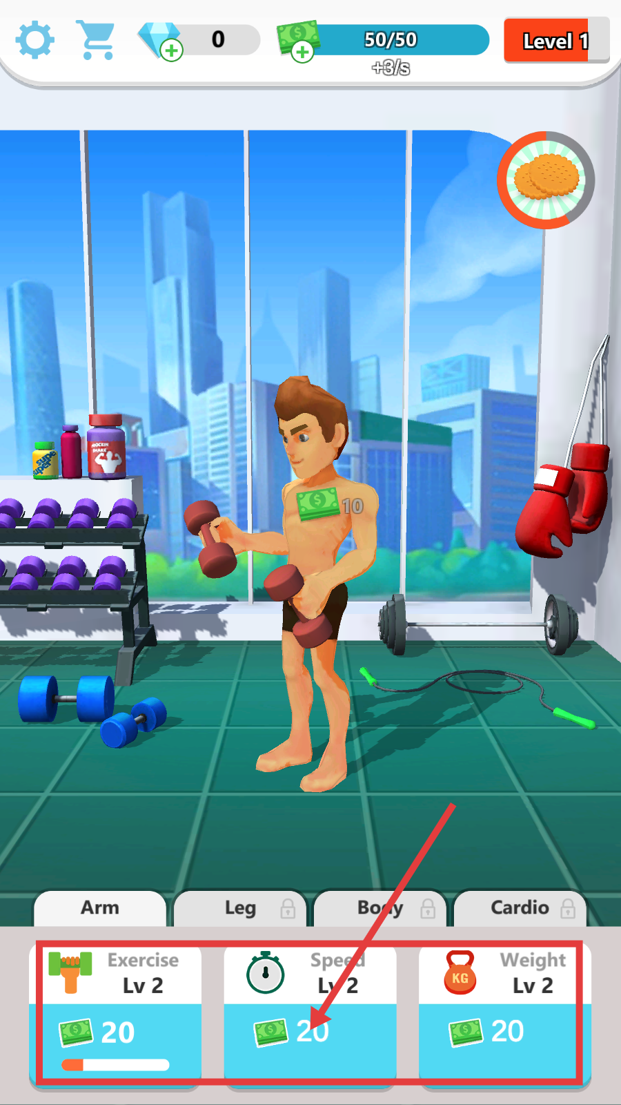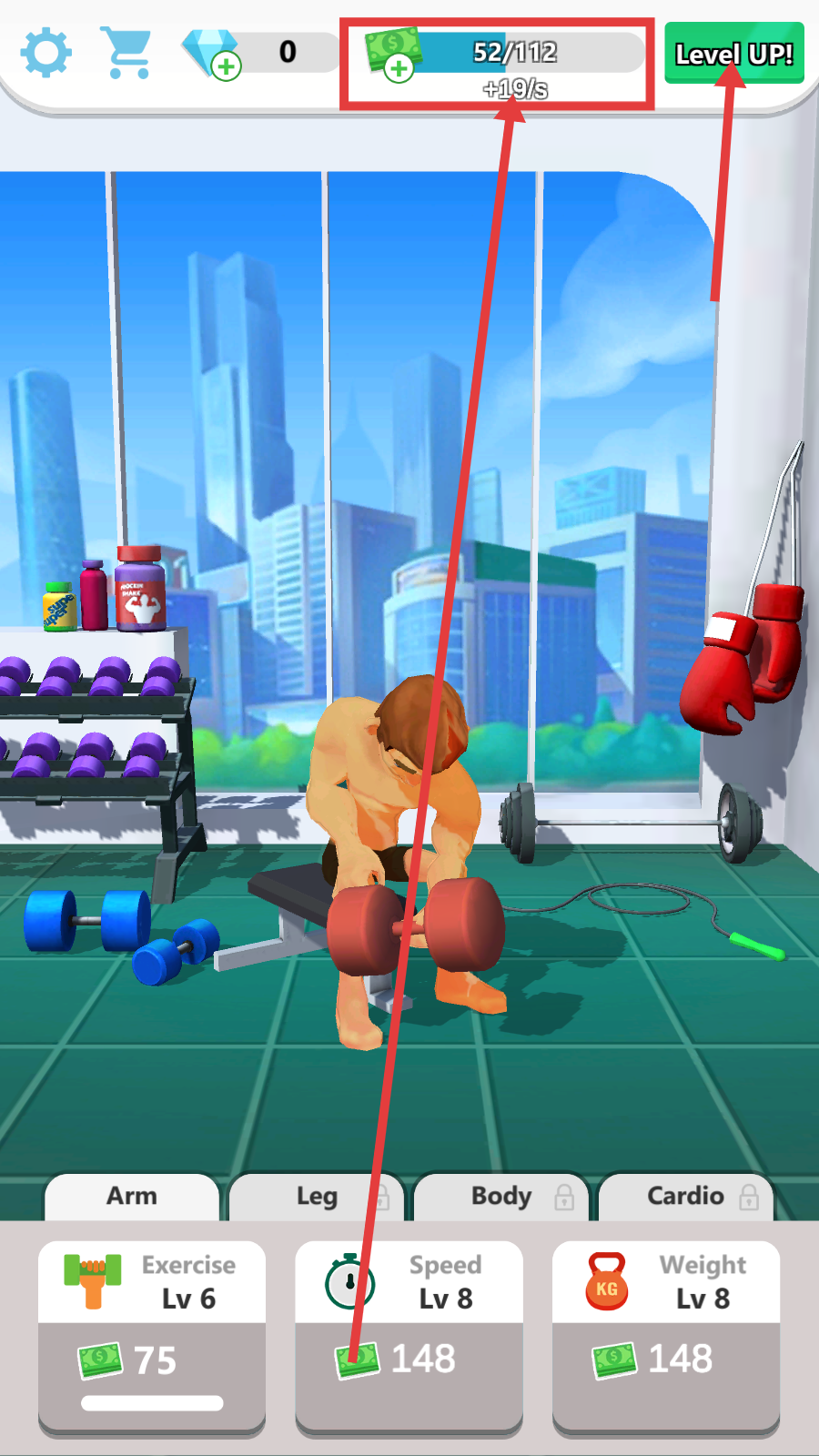 2、使用货币升级【Exercise-Lv2】【Speed-Lv2】【Weight-Lv2】等属性,增强锻炼效果,获取更多收益。