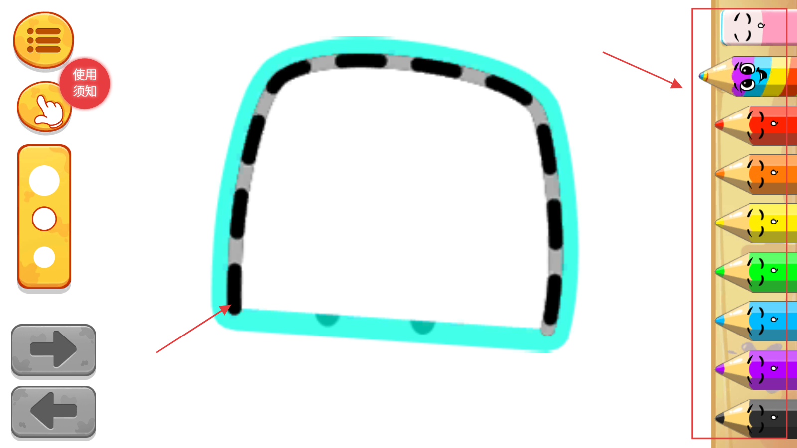 4、选好图案后,在绘画页,可从右侧选彩色画笔,沿着虚线轮廓绘制,完成创作。