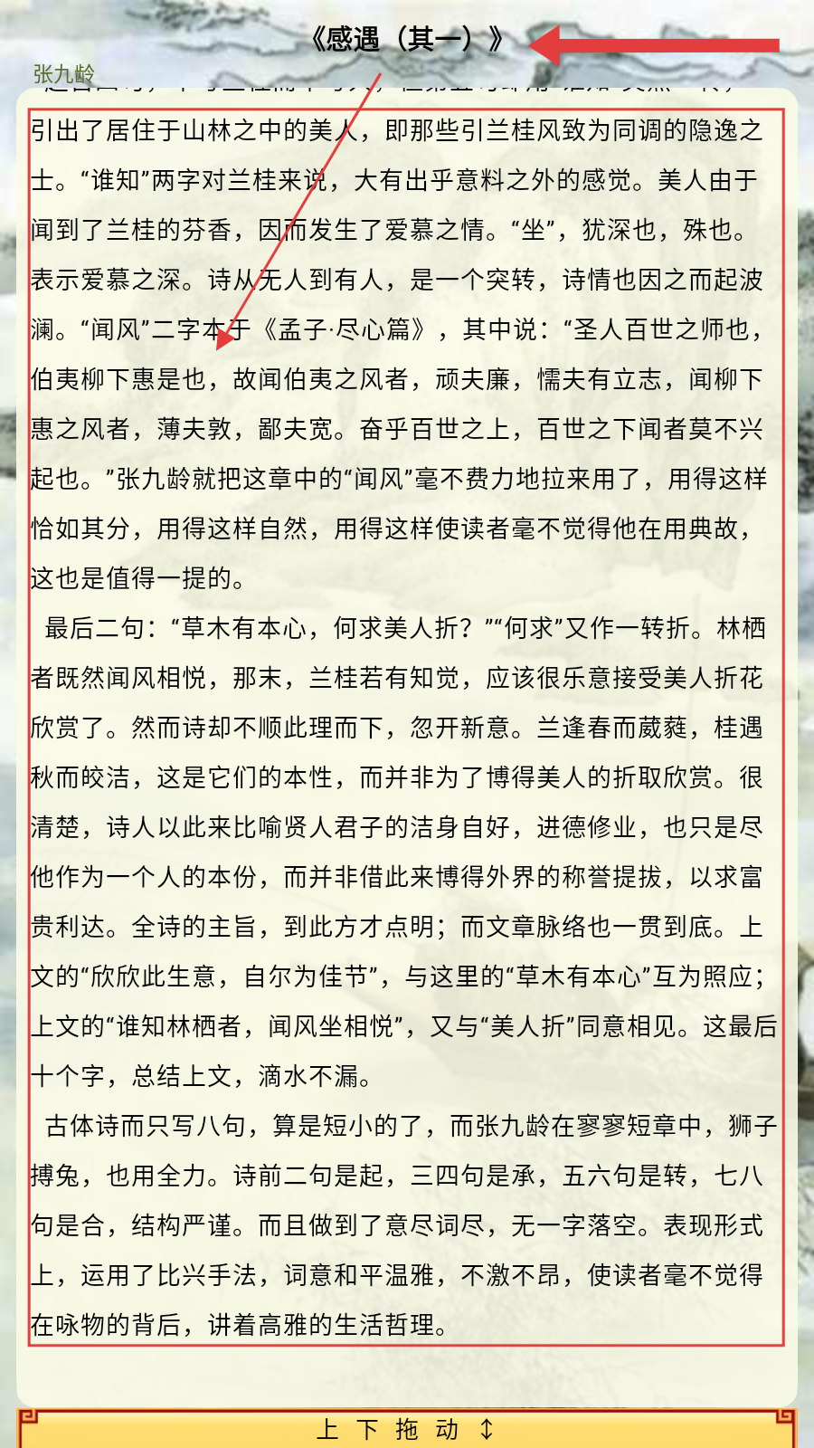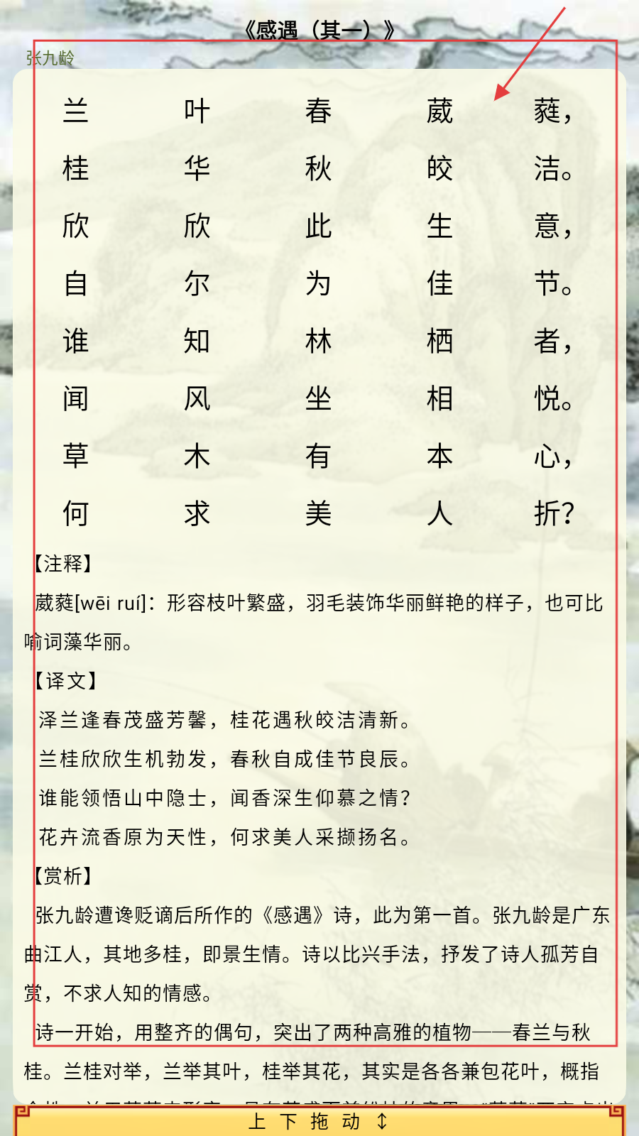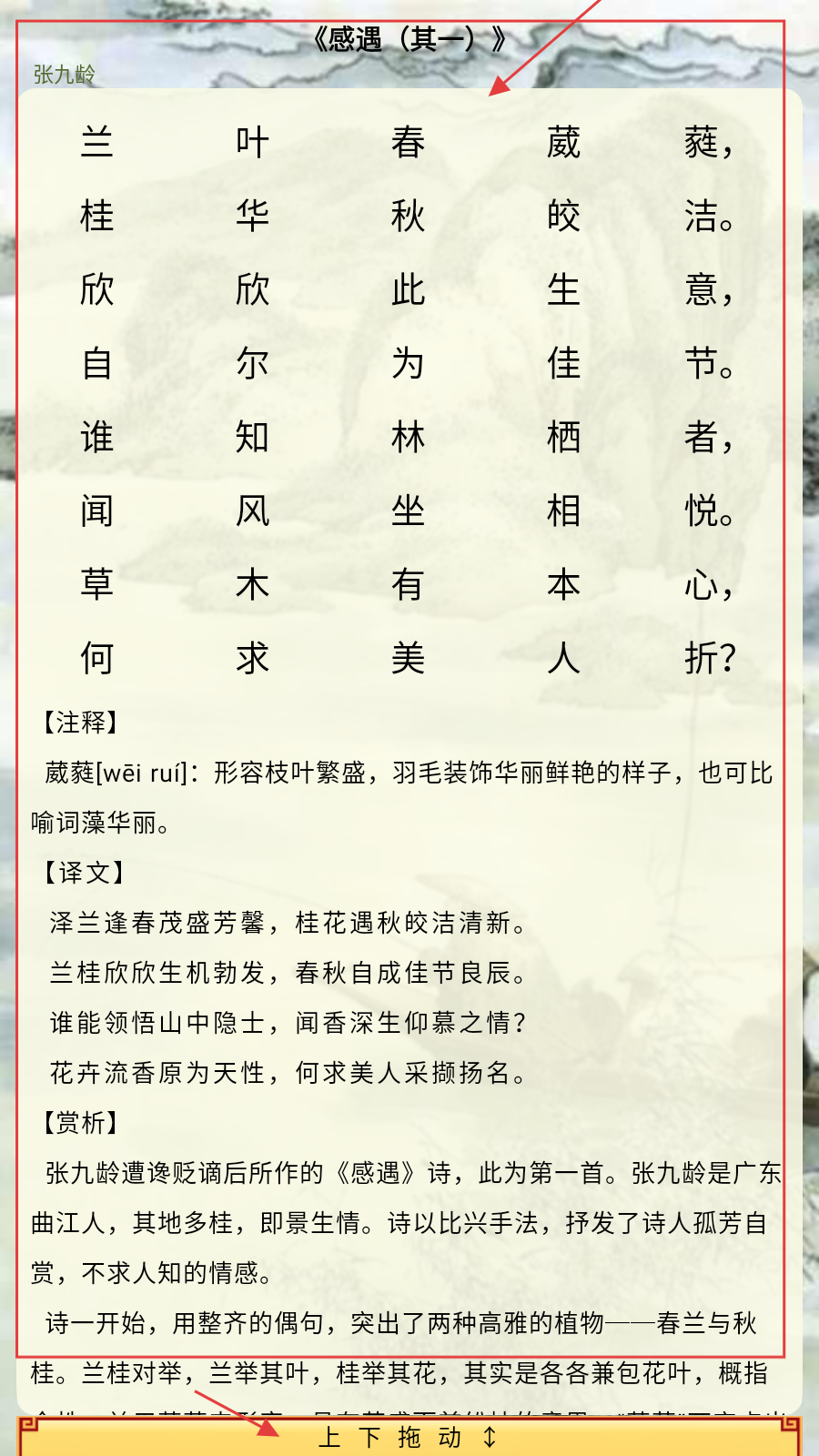 1、打开应用,学习《感遇(其一)》,借助【注释】学习古诗,通过【译文】【赏析】,体会诗人借兰桂抒孤芳自赏之情。