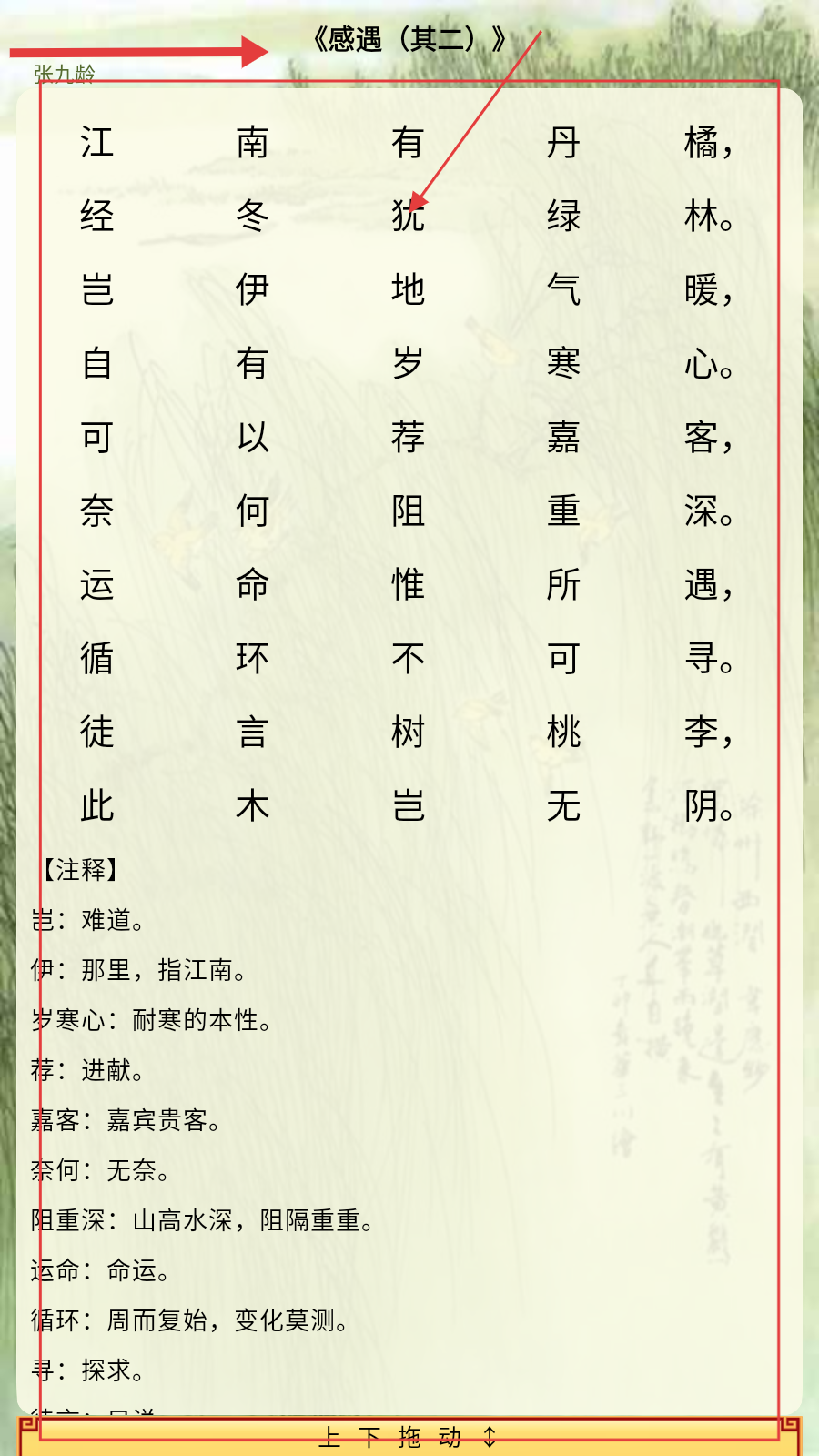 3、向左滑动切换古诗,学《感遇(其二)》,了解江南丹橘相关内容与表达的情感。