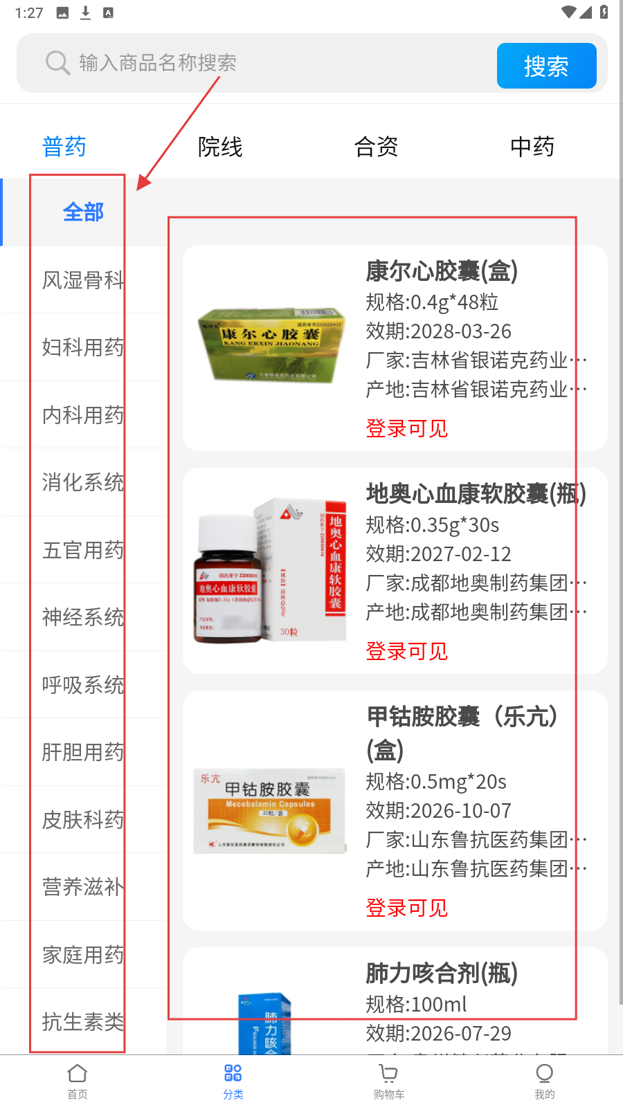 3、在分类页面,可按“普药”“院线”等大分类,或风湿骨科、妇科用药等细分品类查找药品,如康尔心胶囊。