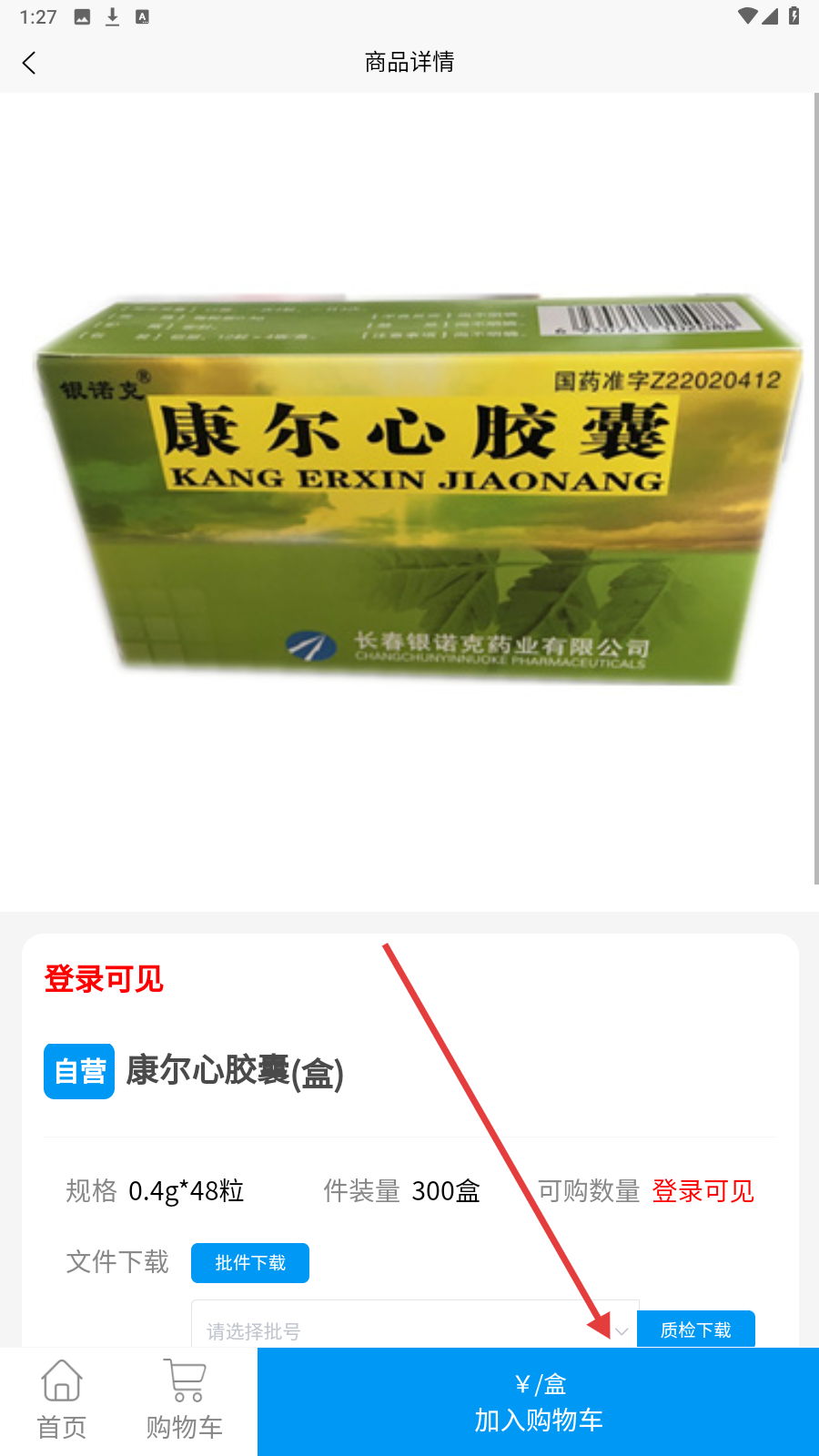 4、查看康尔心胶囊商品详情,能知晓其规格等,如需购买点击【加入购物车】。