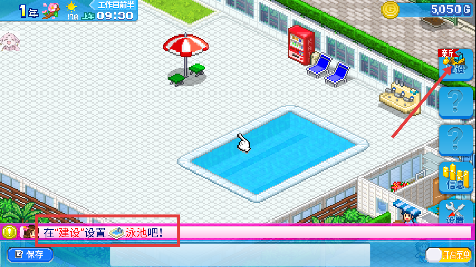 2、进入游戏后,看到提示“在‘建设’设置泳池吧!”,点击右侧【建设】选项,开始泳池建设流程。