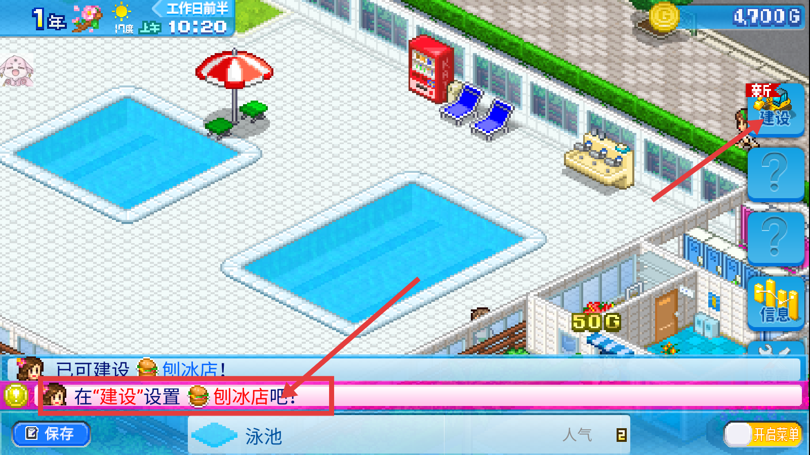 4、泳池建成后,看到提示“在‘建设’设置刨冰店吧!”,再次点击右侧【建设】,准备建设刨冰店。