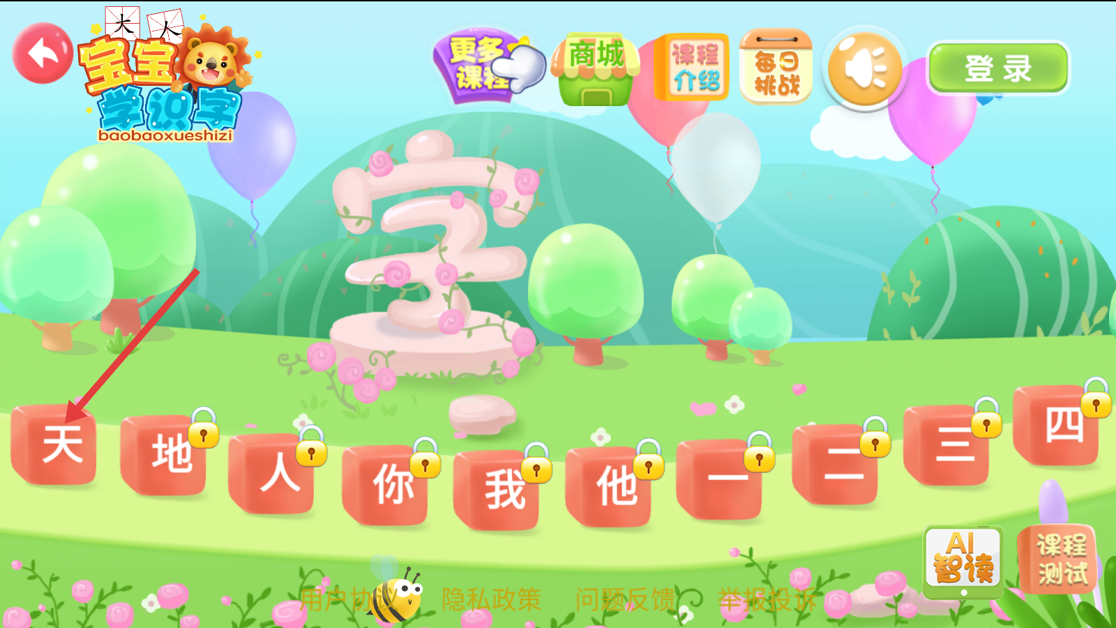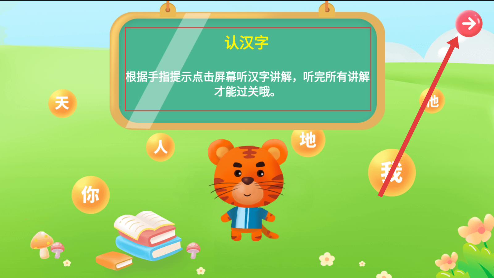 3、出现【认汉字】提示,按指引点屏幕,听“天”字讲解,听完才能过关。