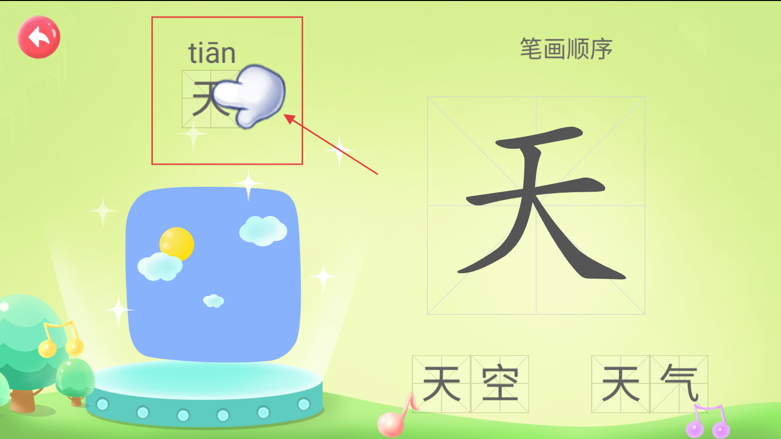 4、跟指引点“天”字区域,学“天”的读音“tiān”、笔画及“天空”等组词。