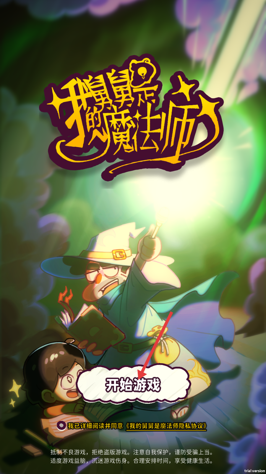 1、进入《我的舅舅是魔法师》后,勾选同意《我的舅舅是魔法师隐私协议》,点击【开始游戏】,开启魔法主题的游戏之旅。