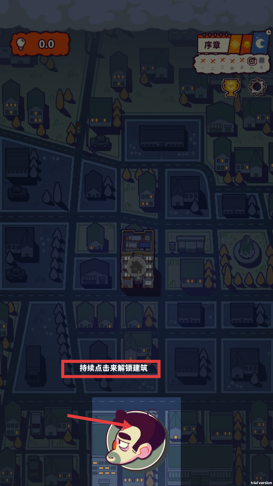 2、在地图界面,按照提示【持续点击来解锁建筑】,逐步解锁可建设的建筑区域,为后续发展打基础。